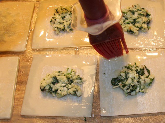 Take a pastry brush and brush the 4 edges of the wrappers with the egg wash.