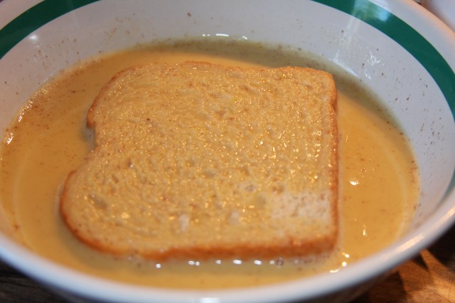 Next, pour about half of your egg mixture into a shallow bowl. You are going to dip each piece of bread into it, making sure to coat both sides well. Shake the excess off then place on the pan to cook. Continue with each piece of bread.