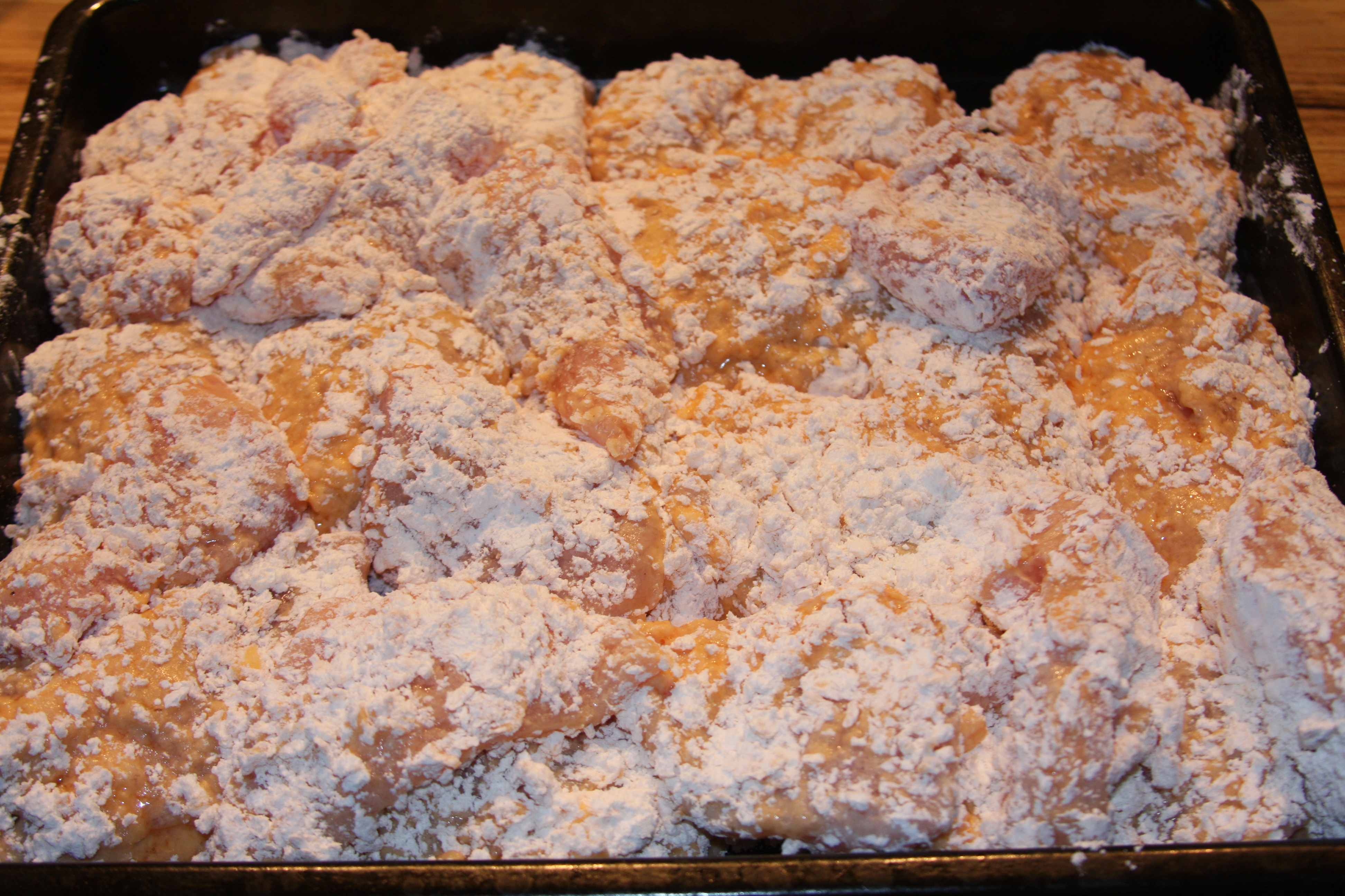 In a medium-size bowl, using a whisk, beat the eggs with the hot sauce until well blended. In another medium bowl, mix the flour, corn starch, and salt and pepper until well combined (I use a whisk for this too). Dip the chicken in the egg mixture and then into the flour mixture. Then repeat this step again so that your chicken has a nice thick coating on it.