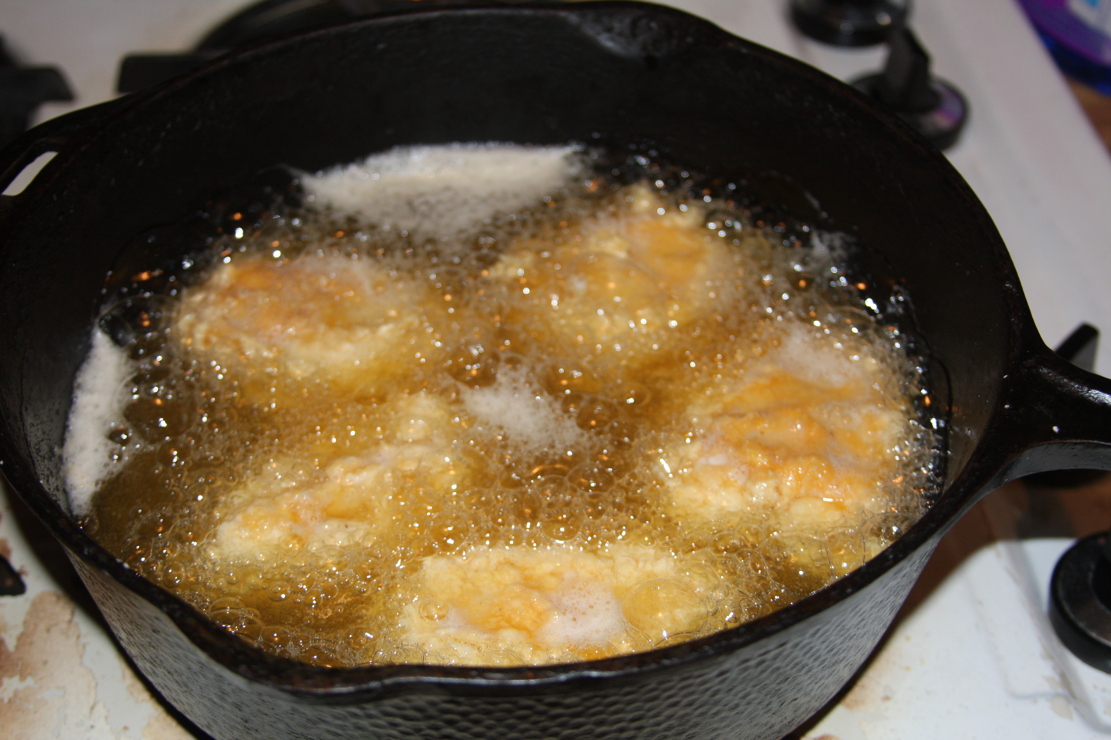 In a deep-fryer or heavy-bottomed pot, heat enough oil to come halfway up the sides of the pot, to 350 degrees F. Fry the chicken for about 3-4 minutes per side, or until juice is clear and chicken is cooked through.