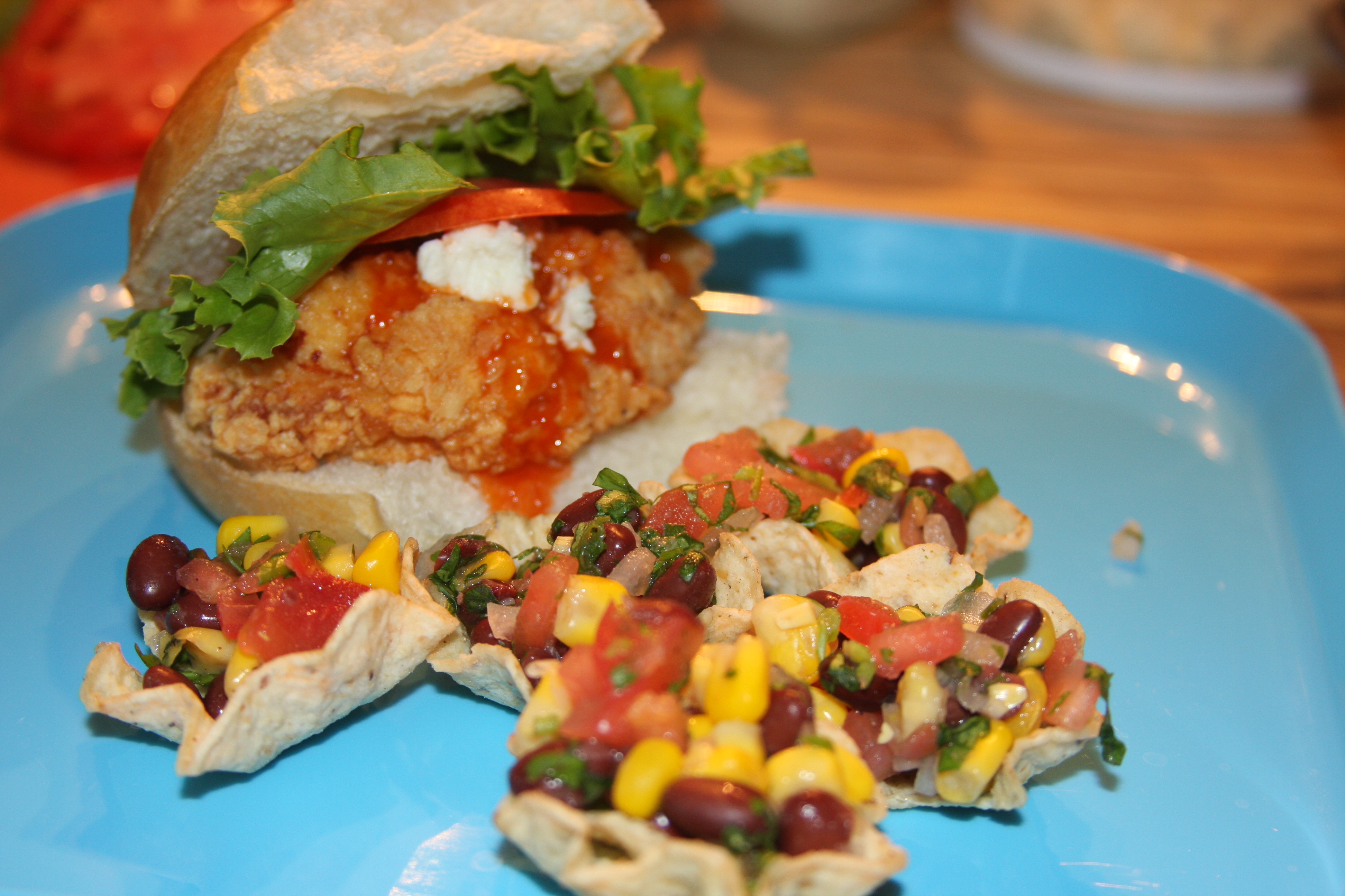 Remove chicken from pan/deep fryer and let drain on a paper towel lined plate. Put the chicken on the buns and then top with crumbled blue cheese, blue cheese dressing, lettuce tomato, pickles…whatever your heart desires!