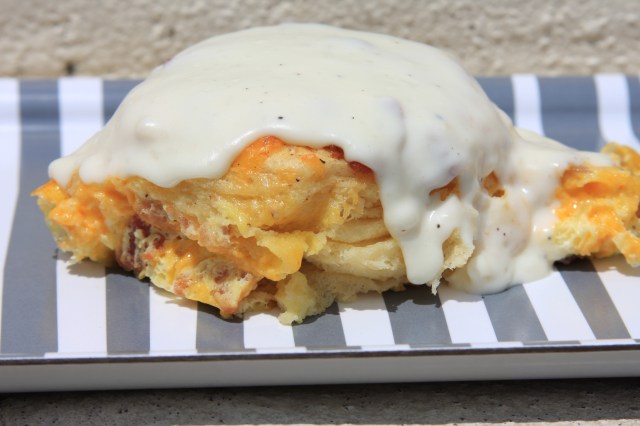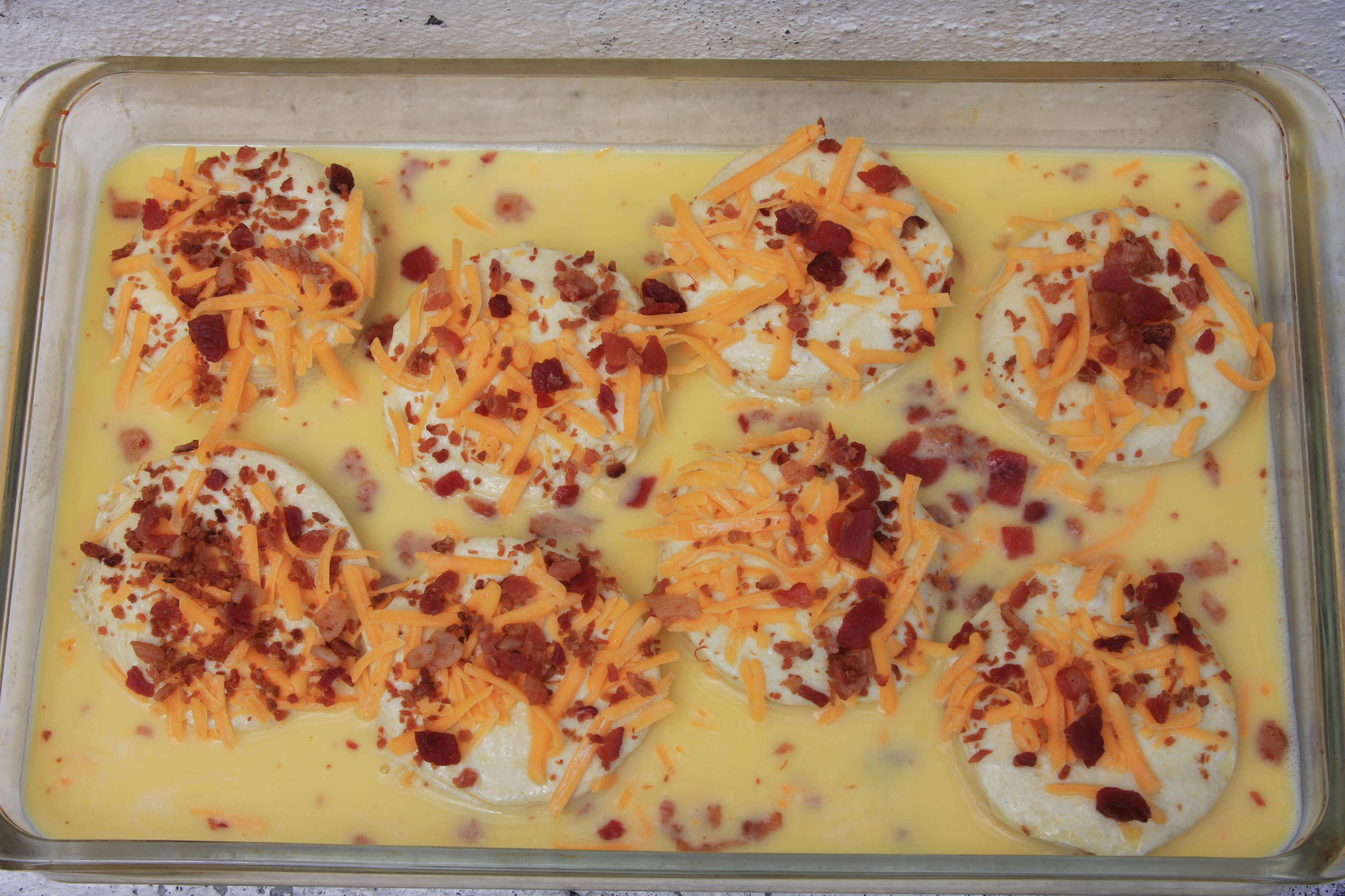 Bake according to the package directions for the biscuits. Just check to make sure that your eggs are all the way cooked in the middle of the dish. Serve with gravy.