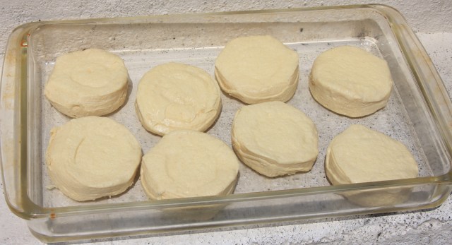 Grease the bottom and sides of a 13 x 9 baking dish. Place biscuits evenly in the pan with some space in between each one.