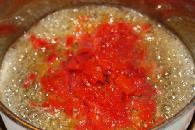 Then add in your roasted red pepper, stir, and let that simmer for about 2-3 minutes.