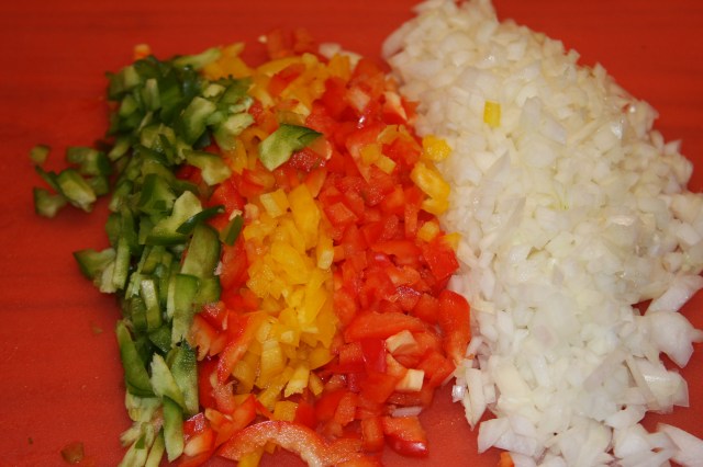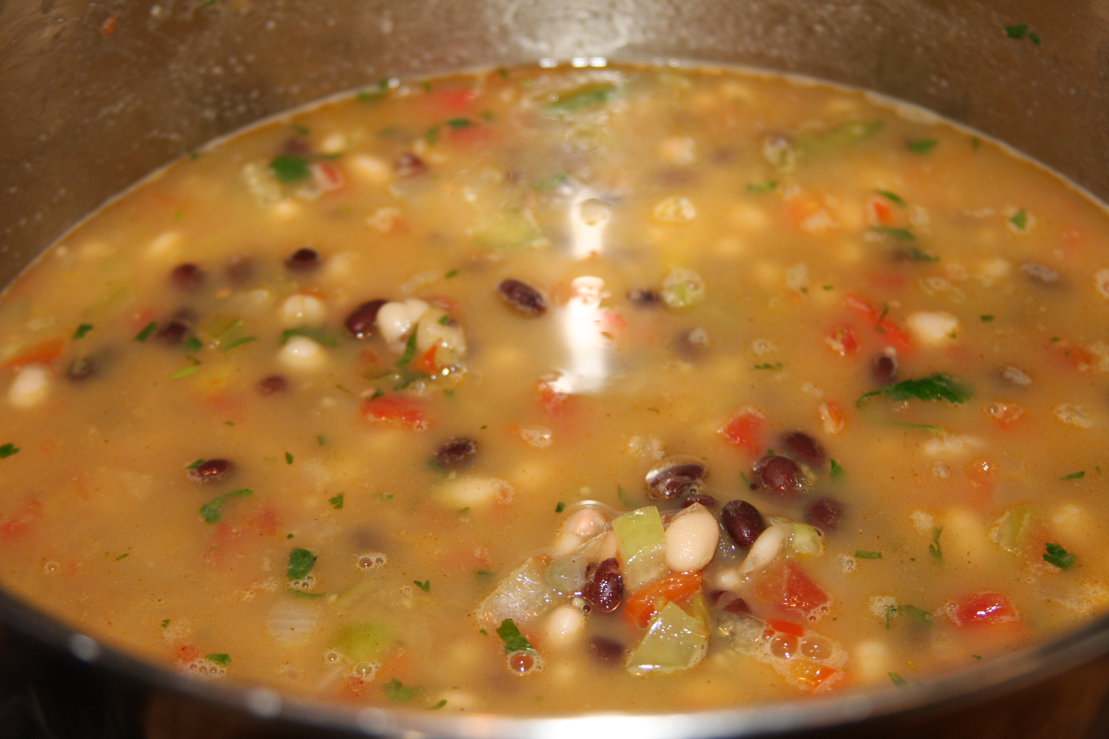 In a large soup pot, heat 2 tbsp oil over medium heat. While it is heating up put in cumin, salt, pepper, chili powder and minced garlic. Add in onion, red, yellow and green peppers, and jalapeño and cook for about 3-4 minutes, until they soften up. Add in chopped tomatillos, cilantro, lime juice, 2 cans of chopped green chili’s and 2 cans of Rotel tomatoes. Sauté for about 6 minutes, stirring occasionally, until they are softened. Add in all of your beans and chicken broth and stir so that everything is combined. Cover and let simmer on low heat for about an hour. I checked this about half way through, giving it a stir and checking to see if the seasonings were ok. You should check it just to make sure you don’t need more seasonings for your taste.