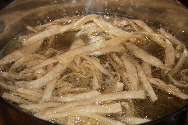 Even though it may seem like extra work, you have to make the fried corn tortilla chips to go with this. It really does take this chili over the top. The crunch was a perfect match. It really only took me about 10 minutes to fry the strips up and I did it during the last few minutes of cooking time on the soup.