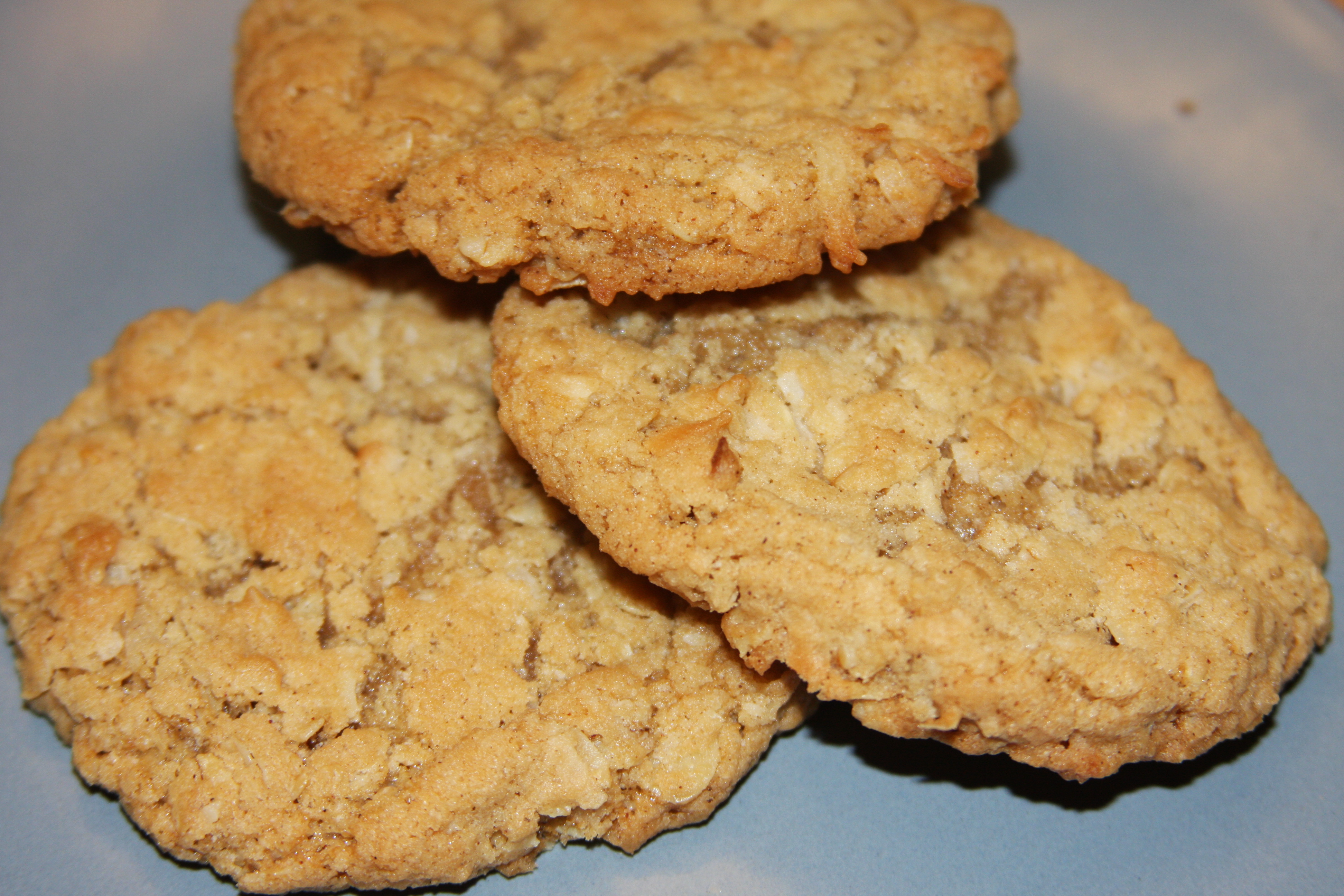 In a large bowl, cream the butter with the sugars until smooth, about 2 minutes with a stand or hand mixer. Add the egg and vanilla, and beat well. Add the dry ingredients and mix thoroughly. Hand stir in the oats and the coconut. Drop by rounded teaspoon fulls (or you can use a medium scoop like I did for larger cookies) onto ungreased cookie sheets, leaving several inches between for expansion.