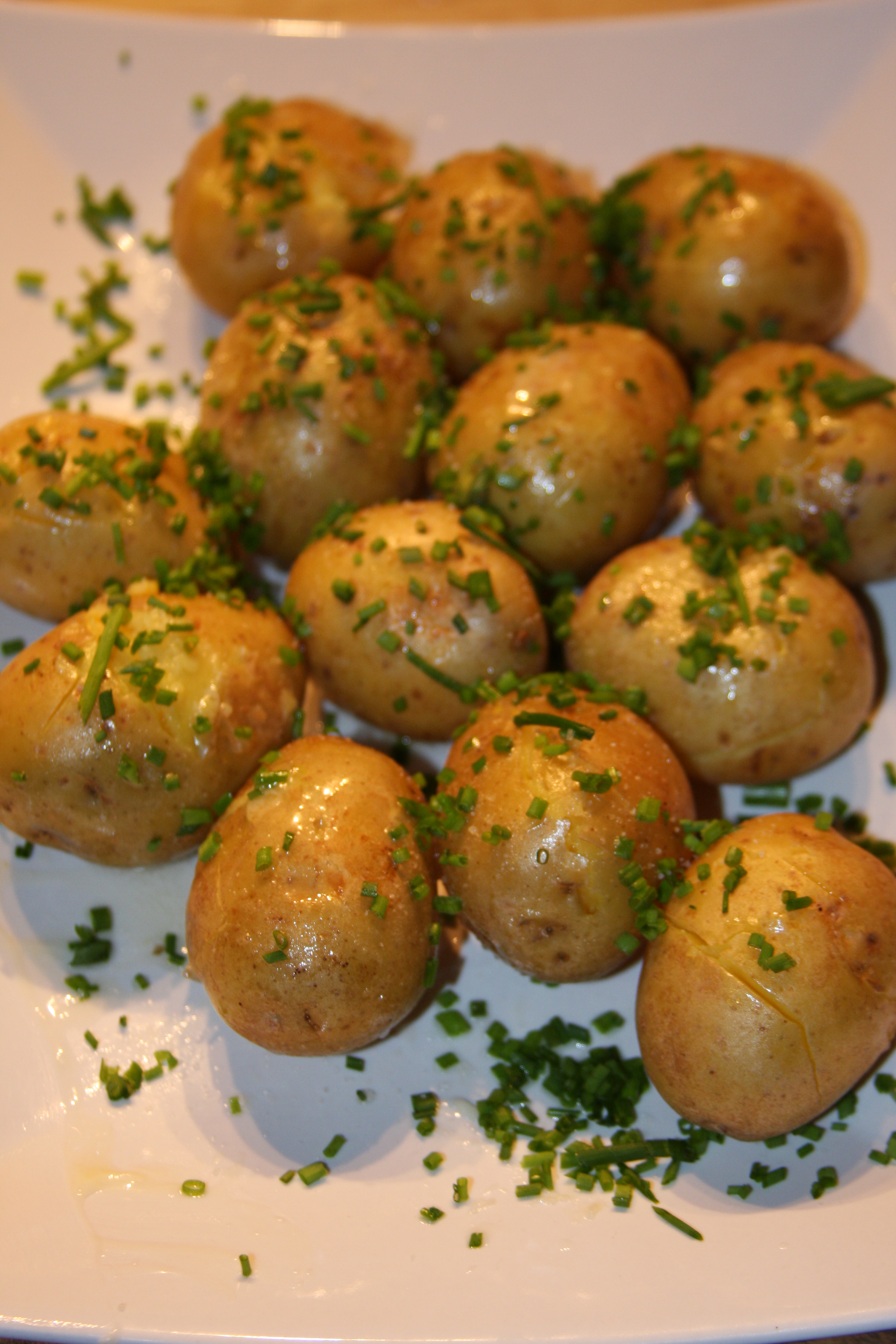1. Nice, I like this. The only change I would make would be to brown a little [2-4 TBS] butter then squeeze the lemon [or dry white wine] into butter reduce slightly [20 seconds] drizzle over potatoes then apply salt and chives!! Potatoes are simply comfort food of the most basic and necessary kind. I will try it your way first!! πŸ˜‰