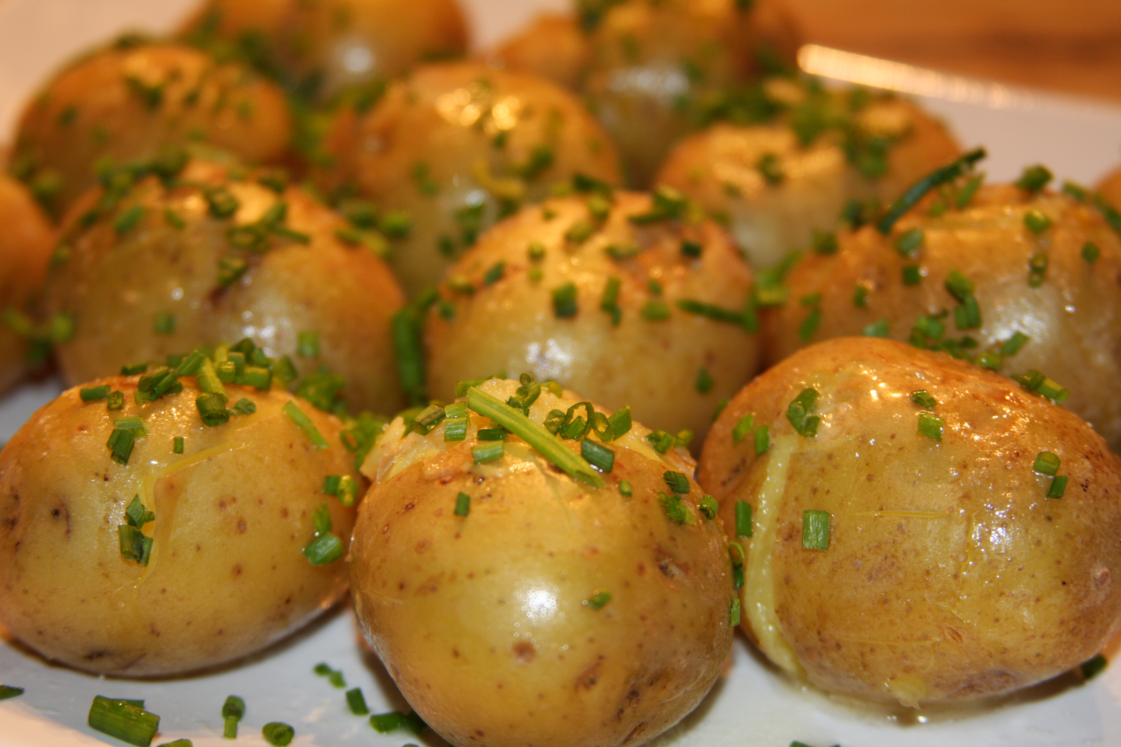 When the potatoes are done, remove them from heat and drain them, then place them on a serving dish.Β  I took a fork and just poked it down in two or three places on each potato. Just enough to break them open just a bit so that the butter and lemon juice get down inside them. Then squeeze your lemon over the tops of the potatoes so that they are all covered. Next, take some butter and put a small piece over each one so that it melts down over the top. Then give them a generous amount of salt and sprinkle the chives over them.
