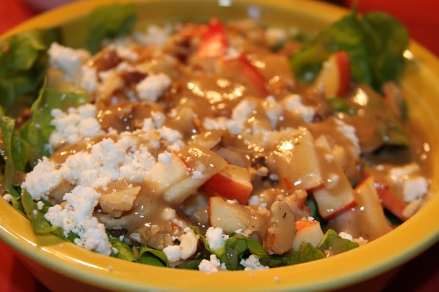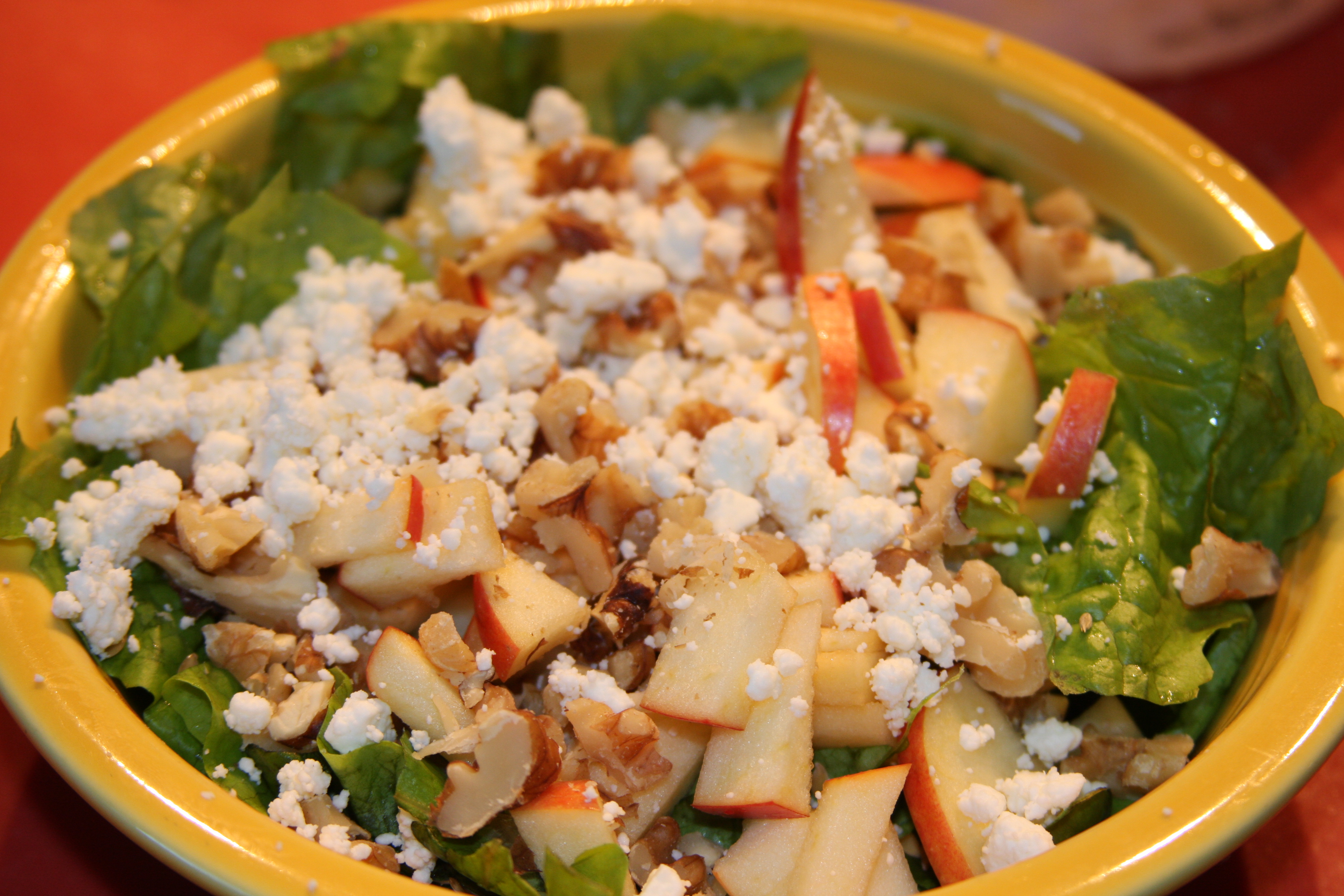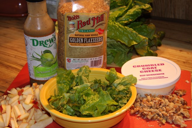 Basically you are just going to chop up your apple and your walnut and tear your lettuce into small pieces. Throw everything else in the bowl and stir it up. Add your dressing. This dressing has a strong flavor and you do not need much on your salad to give it a great flavor.