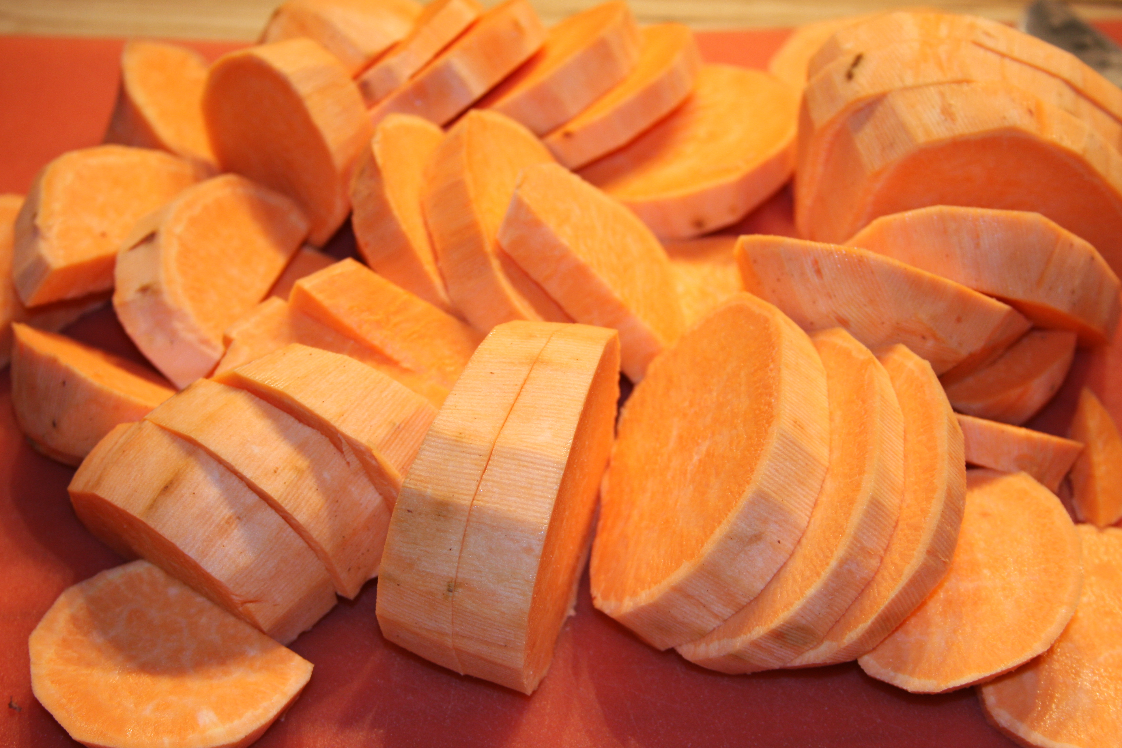 All day yesterday I thought it was Friday. I guess I was really hoping that this week was going to be over already. I hadn’t even thought about dinner and by 7 p.m. everyone was wondering when the heck we were going to eat. I hadn’t been to the grocery so the pickings were slim around here. My husband and kids decided on chicken nuggets and fries and I was definitely not in the mood for that. I had several random things in the freezer and the fridge that I needed to use up that wouldn’t make a full meal, so I just decided to make a few things. One of those things were these sweet potatoes.