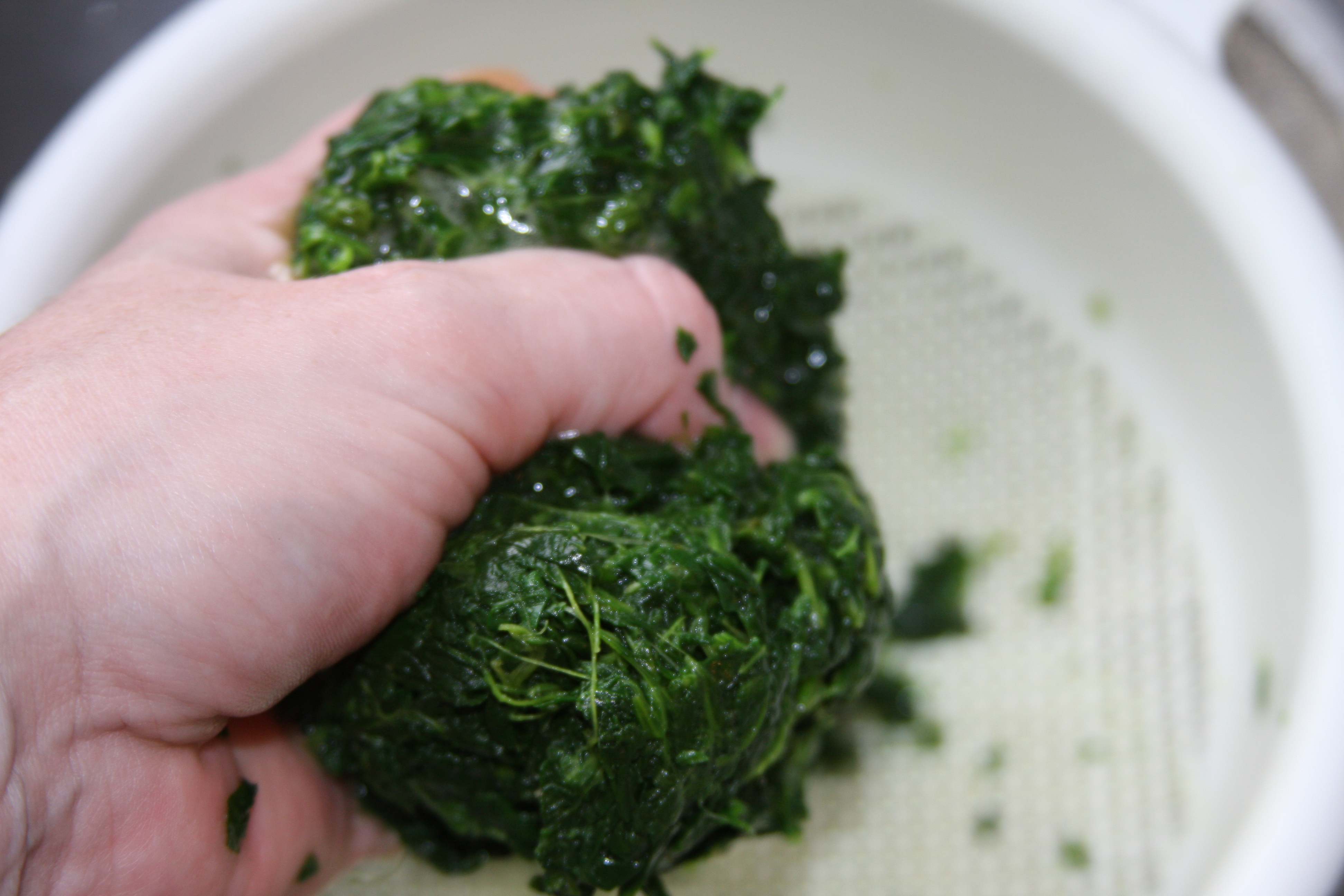 Make sure that you drain your spinach completely. I put my colander in the sink and then place the spinach in there to drain and then use my hands to fully squeeze out all of the liquid from it.