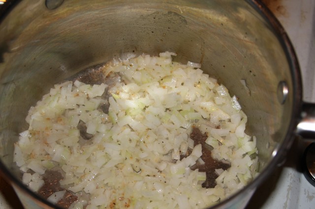 While your chicken is cooking, melt the other 2 tablespoons of butter in large saucepan and add onion and pepper and sauté until soft. I didn’t have a green pepper on hand this time, but I usually put some in.