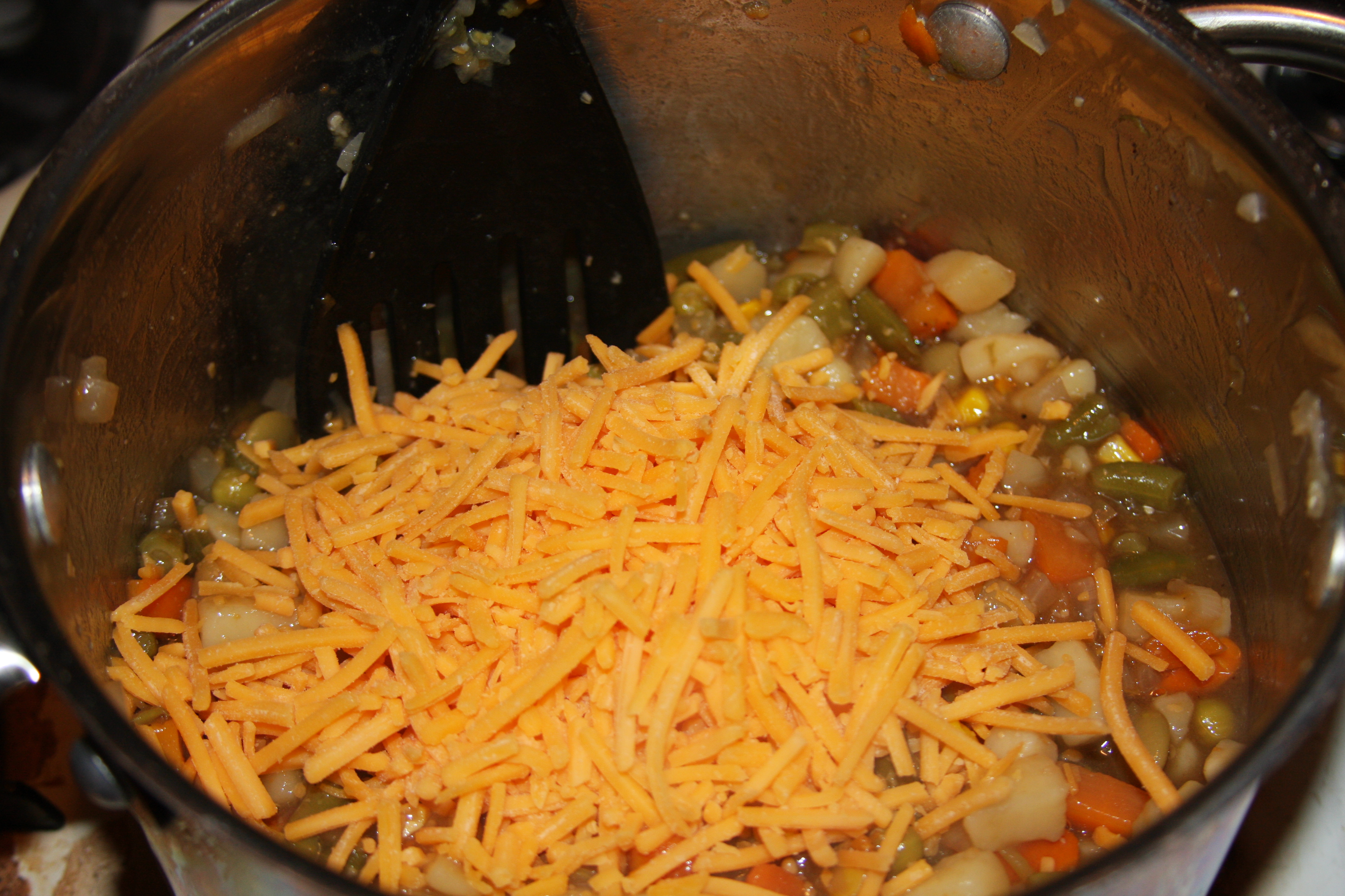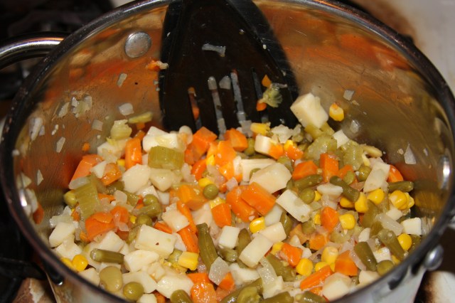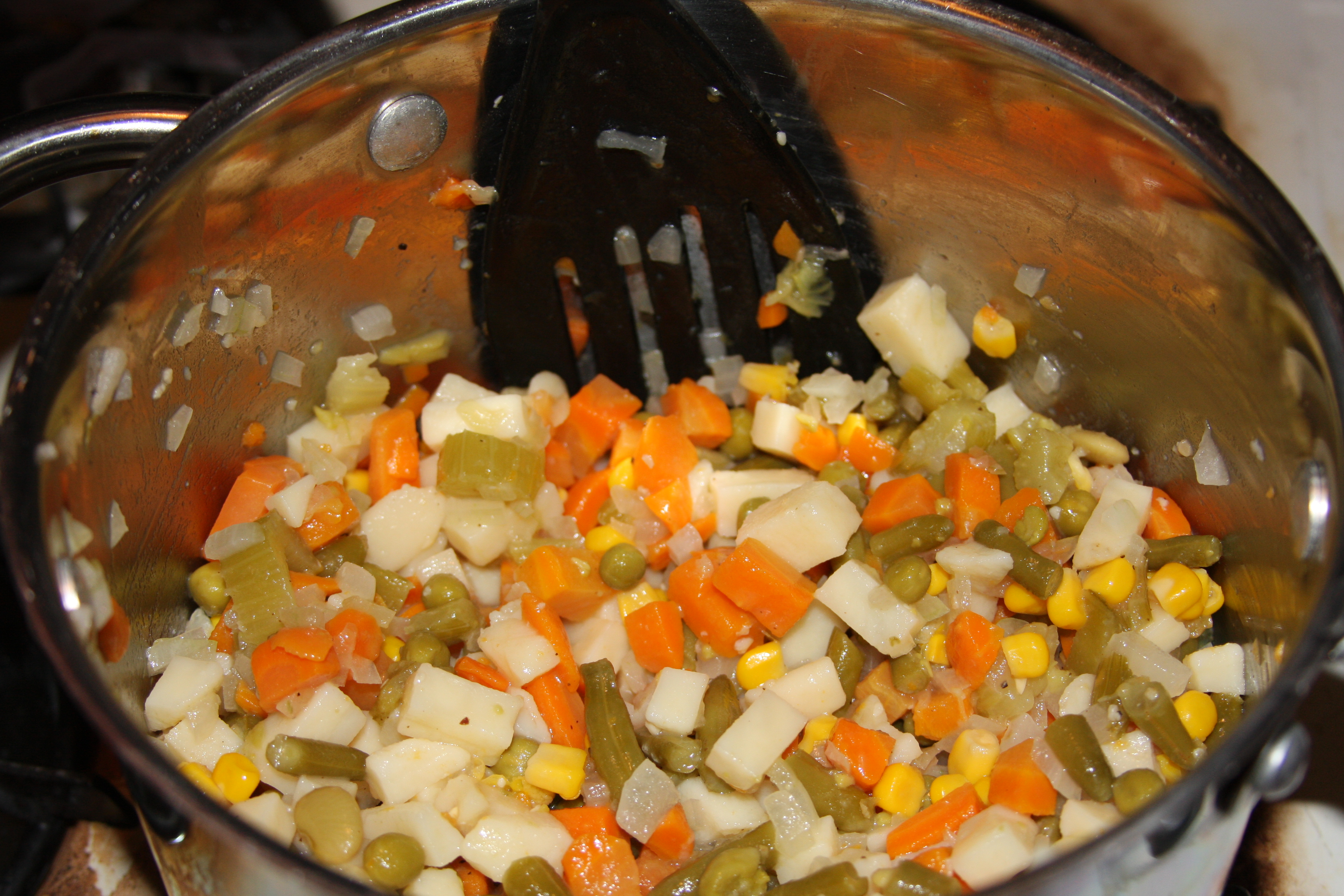 - 4 cups of mixed vegetables, I either used frozen (thawed) or canned (3 cans = 4 cups)