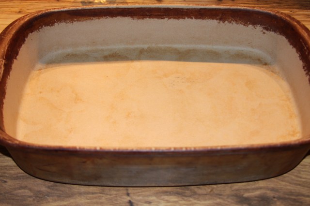 Place in 9×13 baking dish. I this one below from Pampered Chef. I love using the stoneware from PC, you can see this one of mine is well seasoned. I have had it for about 13 years.