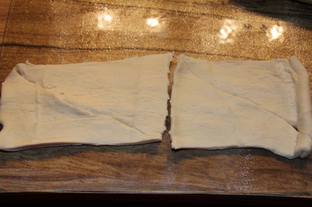 Unroll your crescent rolls and take 2 of the triangles and put them together to form two rectangles. Push the seams together with your fingers to make one piece.