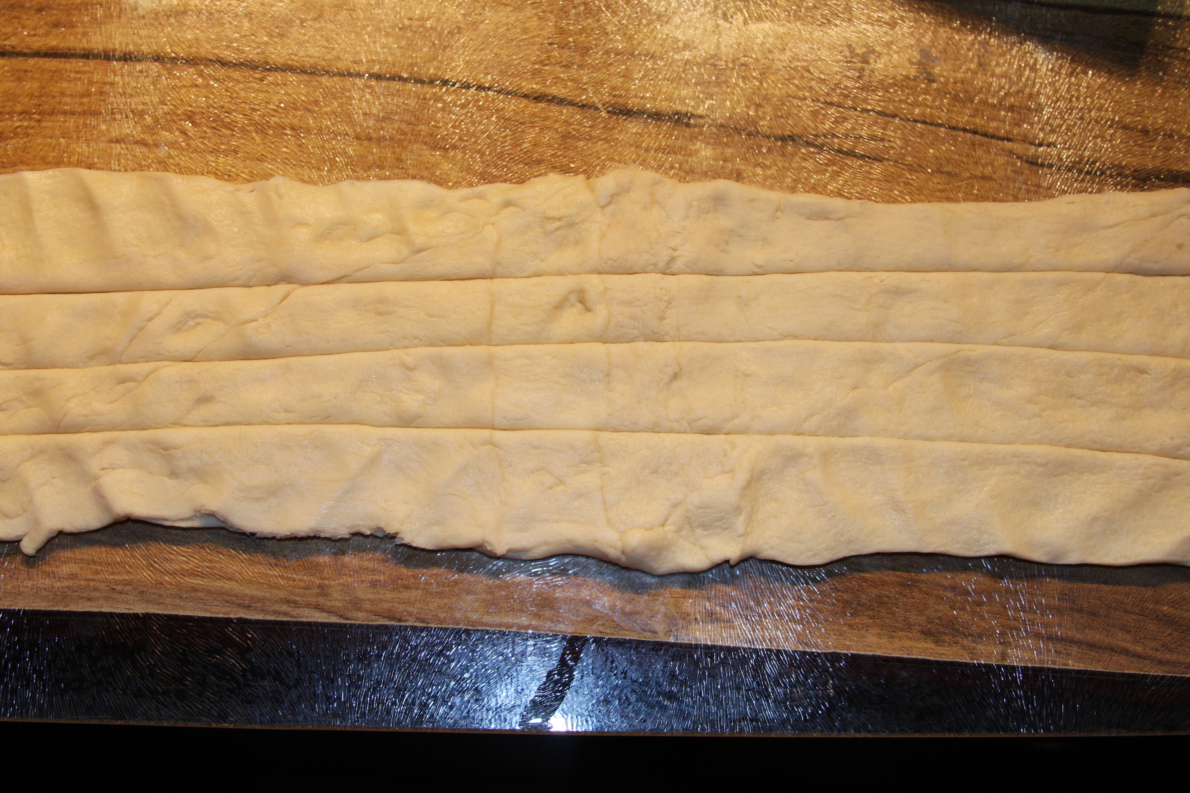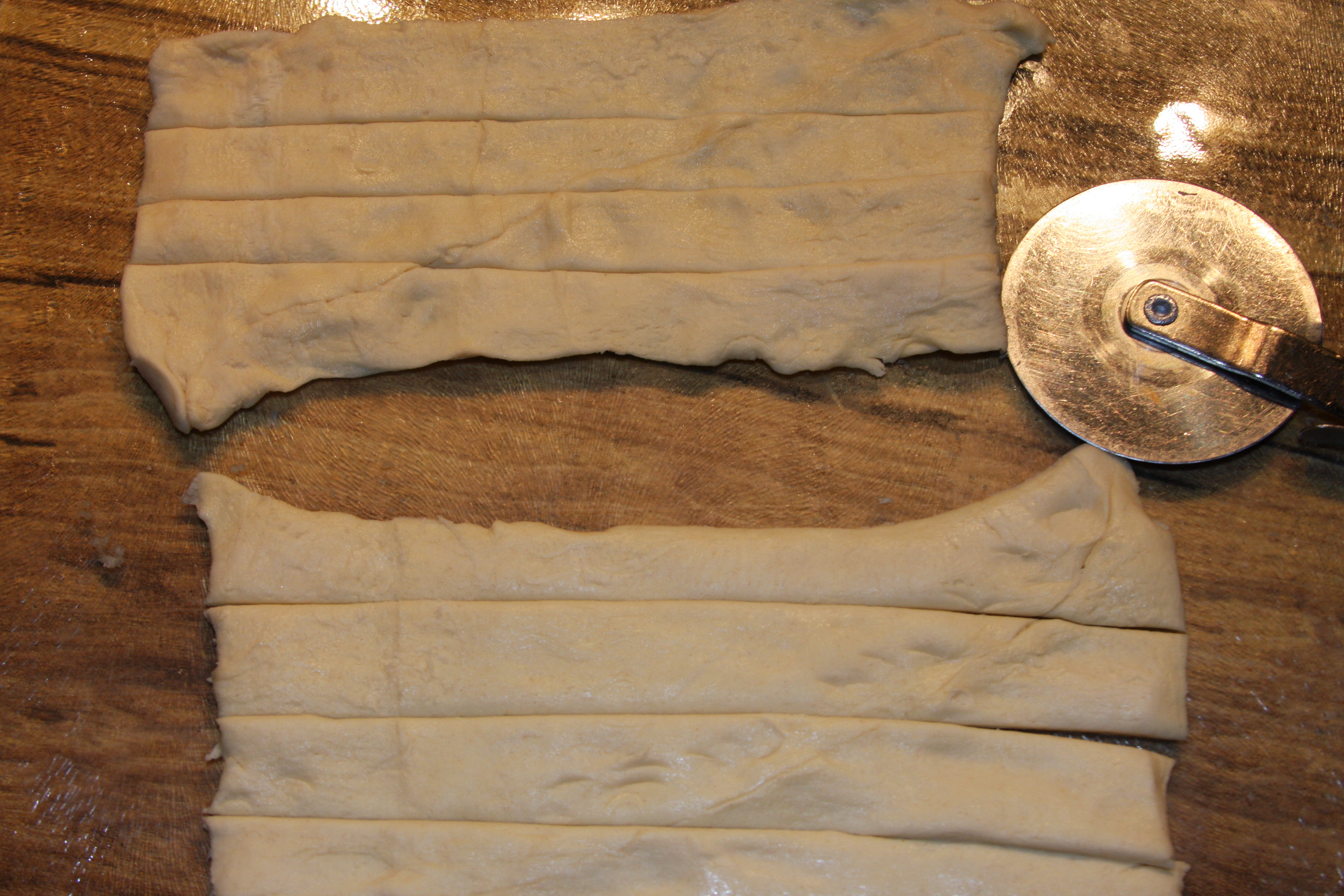 Then take your two rectangles and push the seams of those together to make one large piece. Then take a pizza cutter (or a pastry wheel) and cut long strips out.