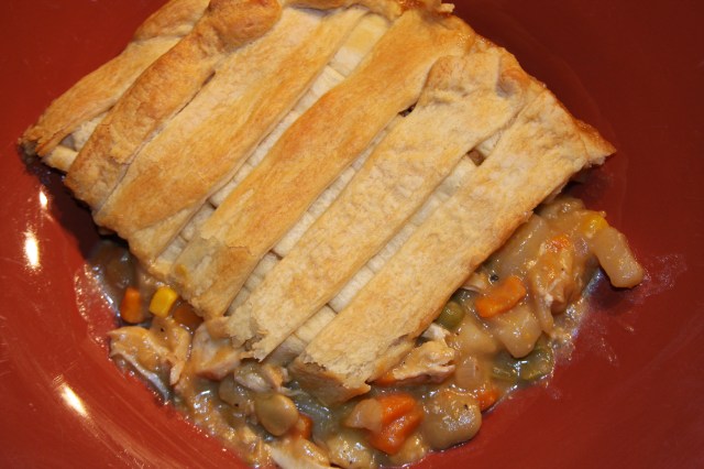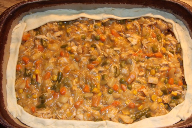 This is one of my favorite dinner recipes. It is one of those recipes that tastes like you slaved in the kitchen all day to make it, but it only takes about 15-20 minutes to put together and about 18-20 minutes to bake. You could even make this one up ahead of time and then top with the crust right before you bake it.