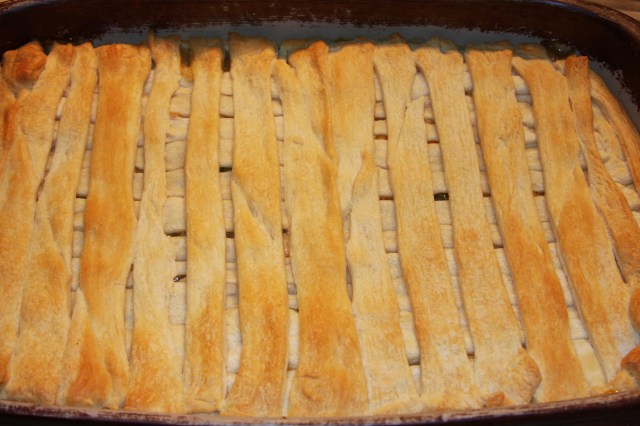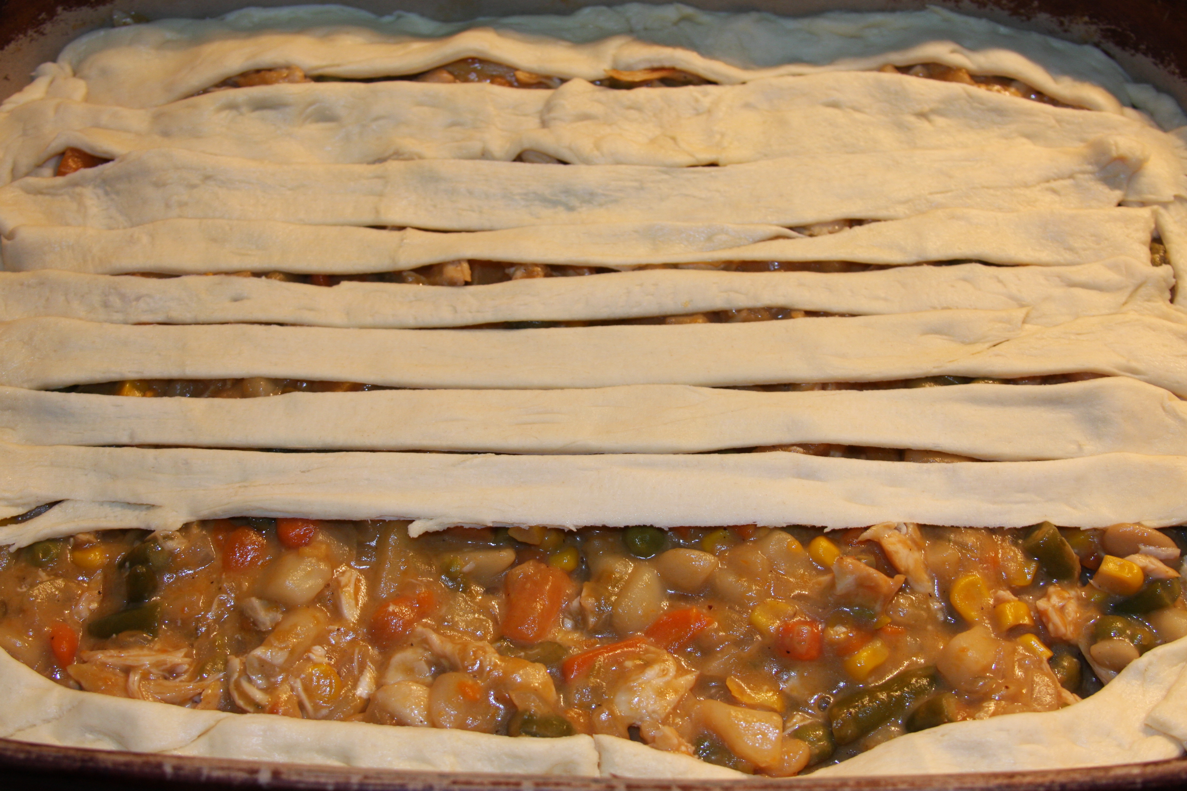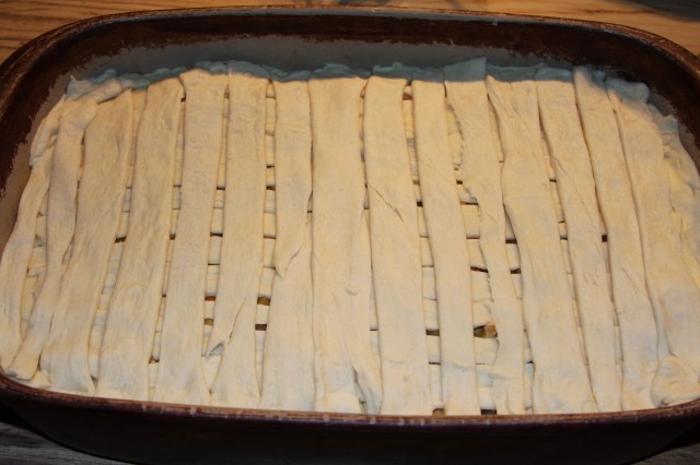 Now you are just going to layer these across the width of the pan. You can see that I am not about making this look fancy. You may want to take the time to make this look beautiful, like lattice work across the top, I just don’t really care what it looks like as long as it’s covered!