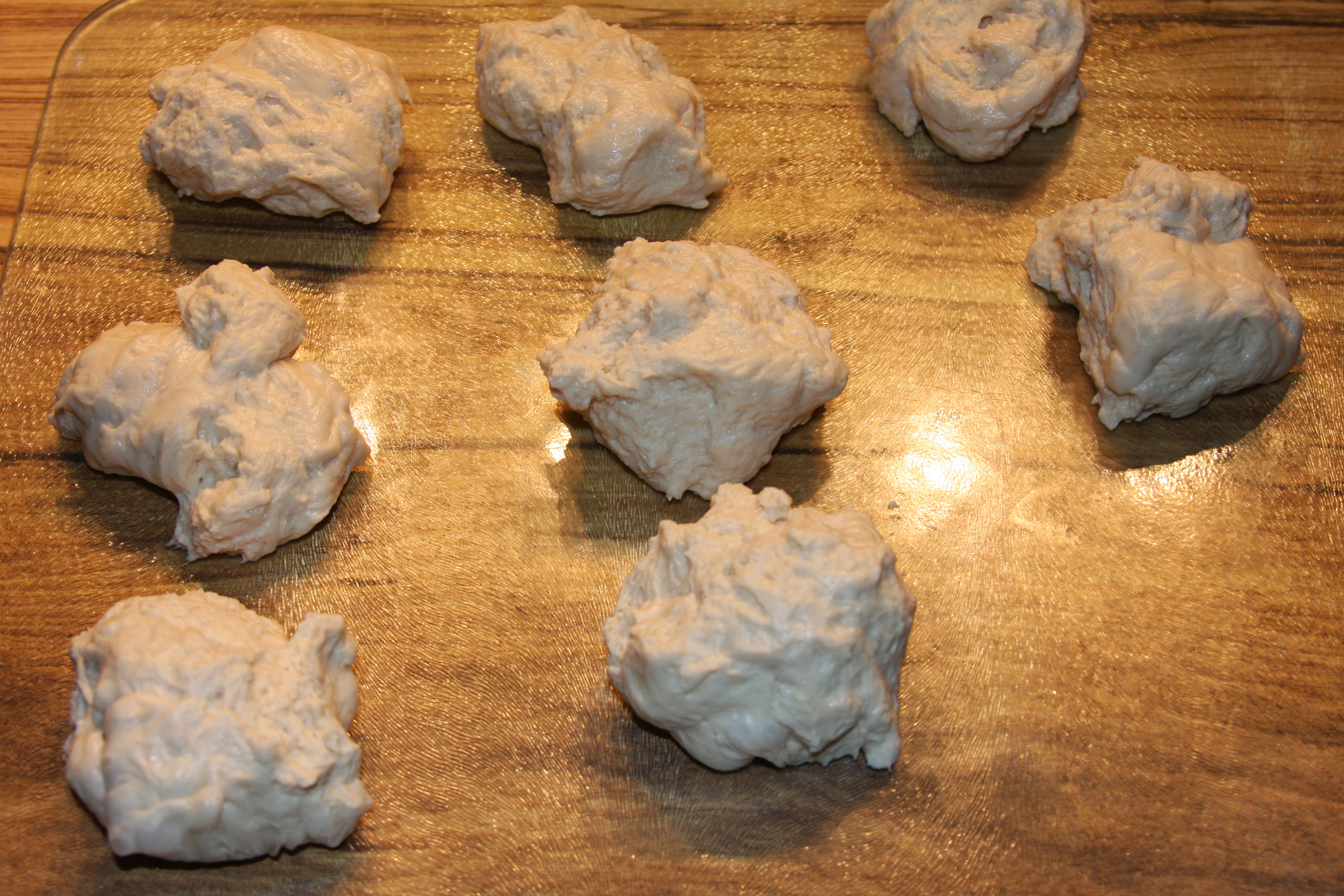 Take it out of the refrigerator about an hour before your going to use it and let it sit. Remove it from the bag and punch it down on a lightly floured surface. I was able to cut this into 9 equal pieces. The ninth and missing piece was in the hands of my daughter who brought in her little stool to reach the counter and “help” me cook dinner!
