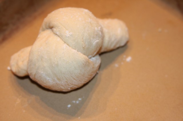 Then just hold up each end, tie it in a knot and place it on a baking sheet/pan.