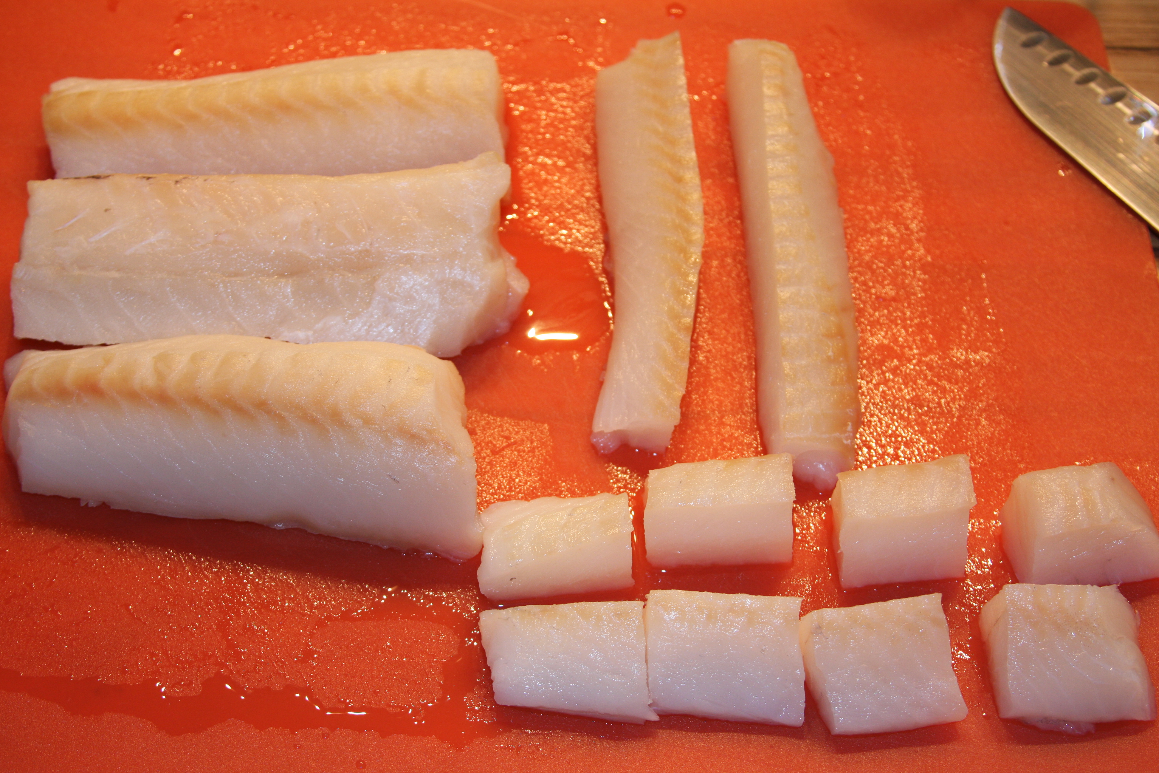 Cut each fish fillet straight down the center making two fillets and then cut each of those into about 8 pieces each. Just like this below, then set aside.