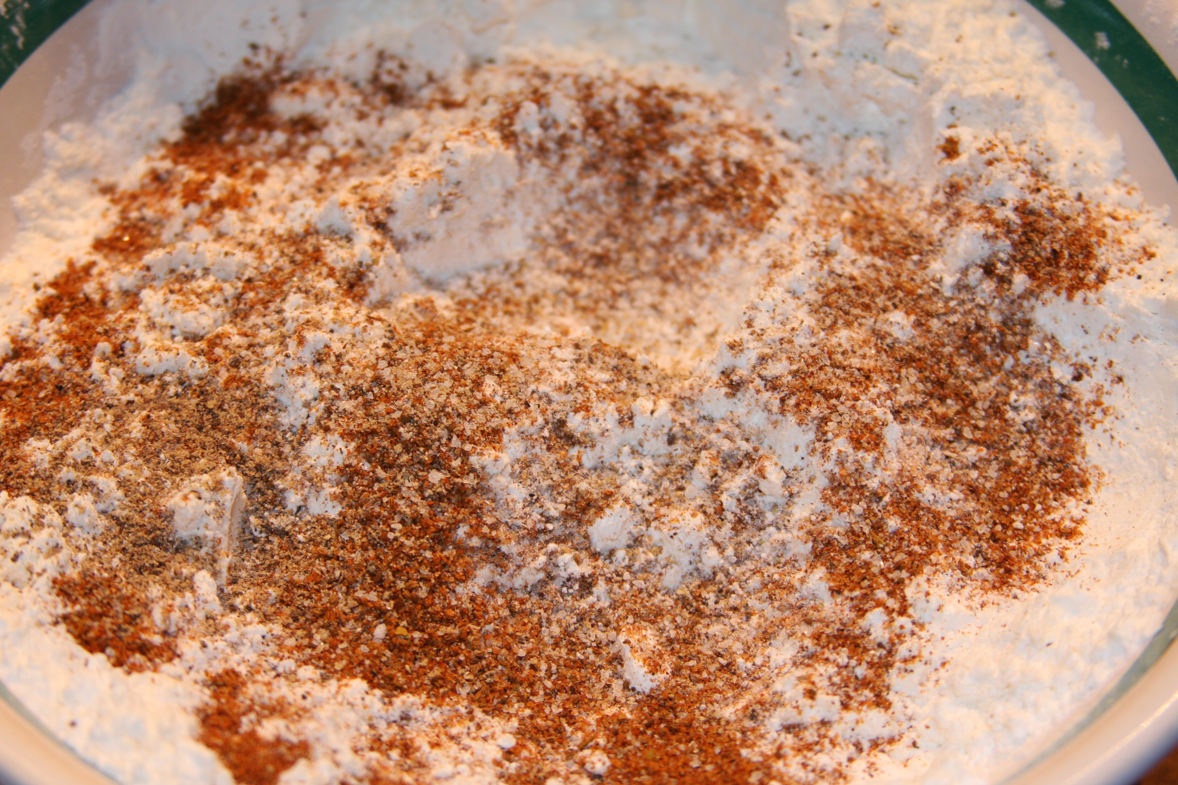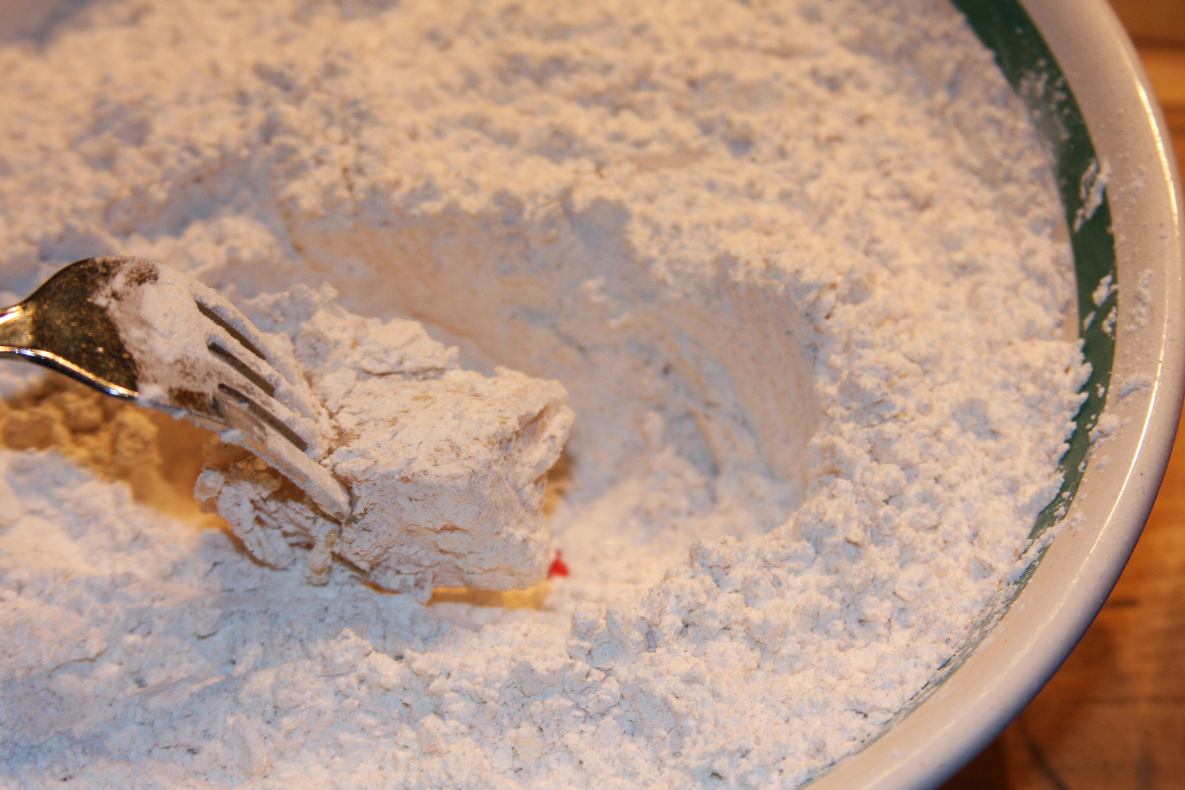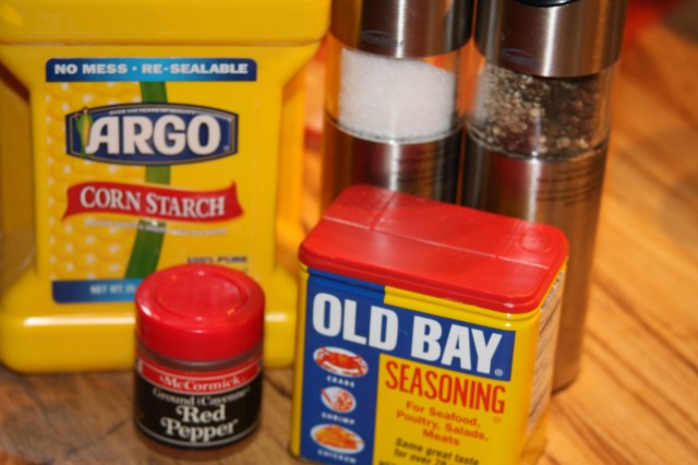 Ina medium sized, shallow bowl you will crack your eggs and whisk until blended. In another bowl, add about 1 1/2 – 2 cups of corn starch, Old Bay, salt and pepper and cayenne. You can just add in the other seasonings according to your taste preference. I didn’t measure any of this, I just kind of added it until you could see it in the corn starch mix. Use a whisk to blend it all together evenly.