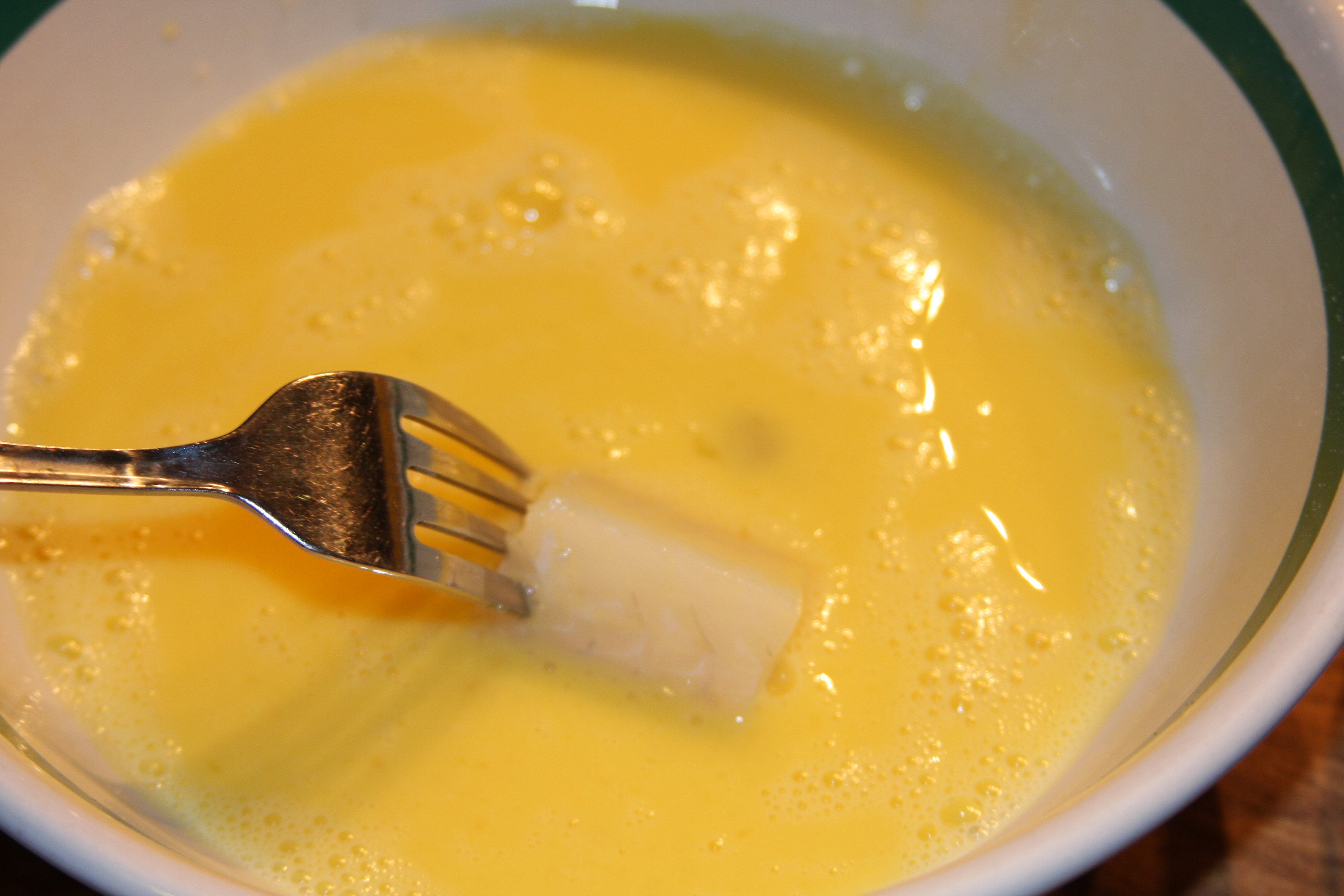 While you are battering the fish, heat up your oil in a large skillet (or heat up a deep fryer). Dip your pieces of fish into the egg, coating well.