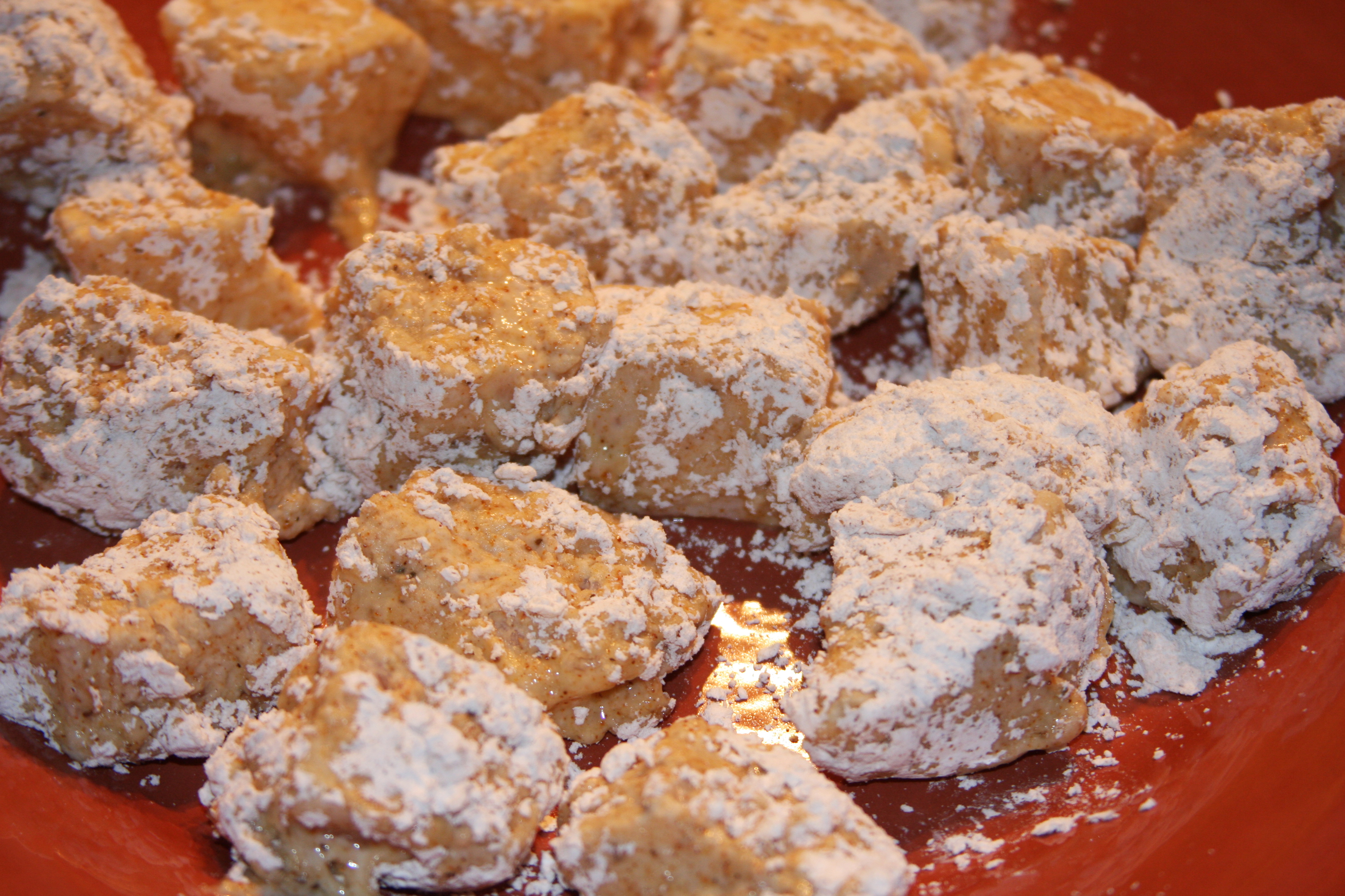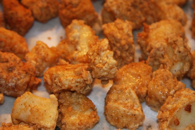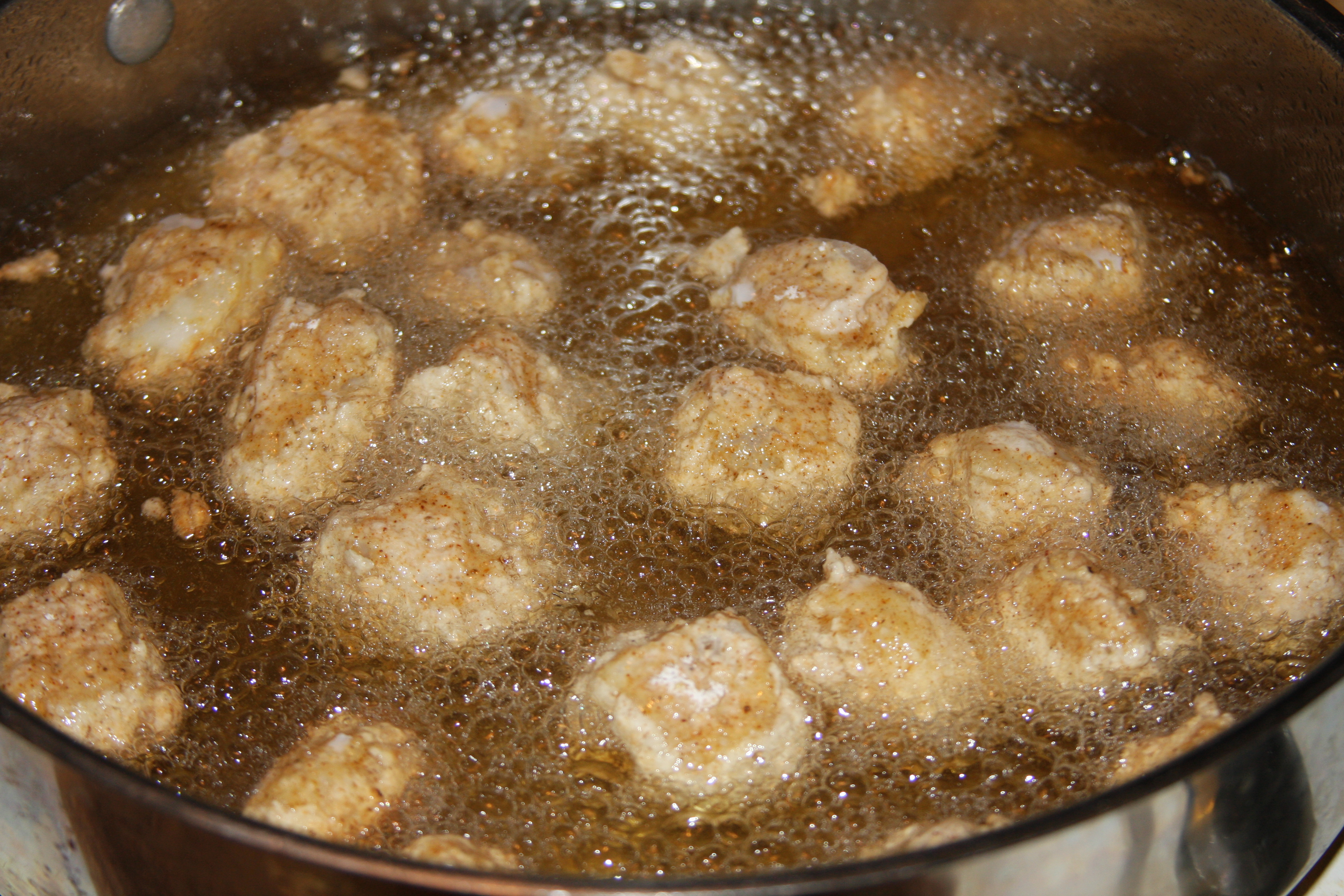 Once they are all battered, you will drop them in the hot oil, being careful not to overcrowd the pan.