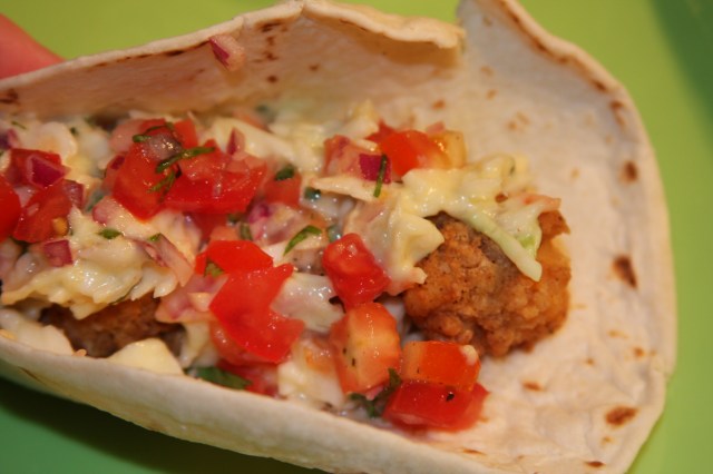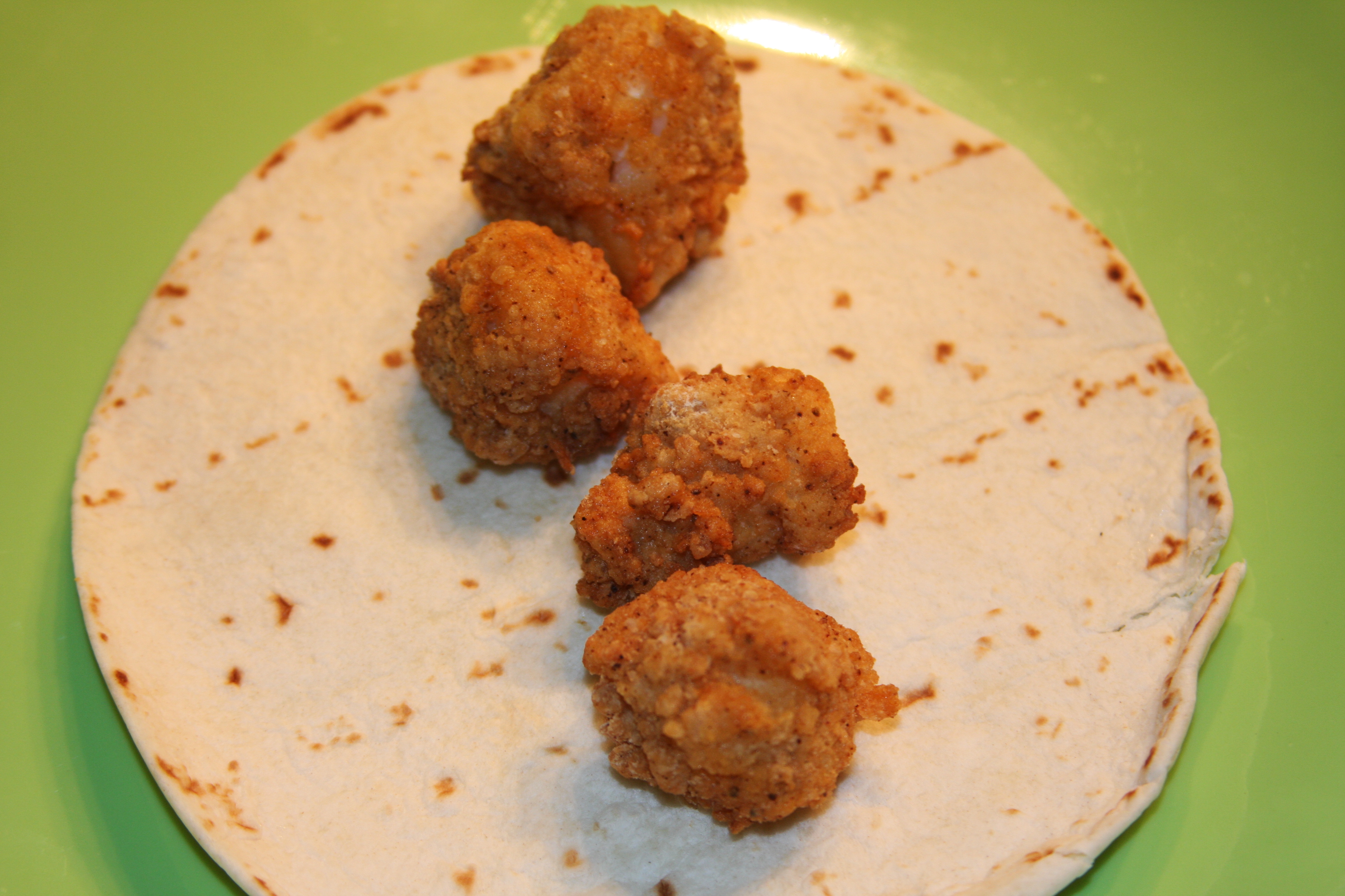 These are little bites of heaven! Once you get them all fried up, lay out your tortilla. I added 4 pieces of fish to each one.