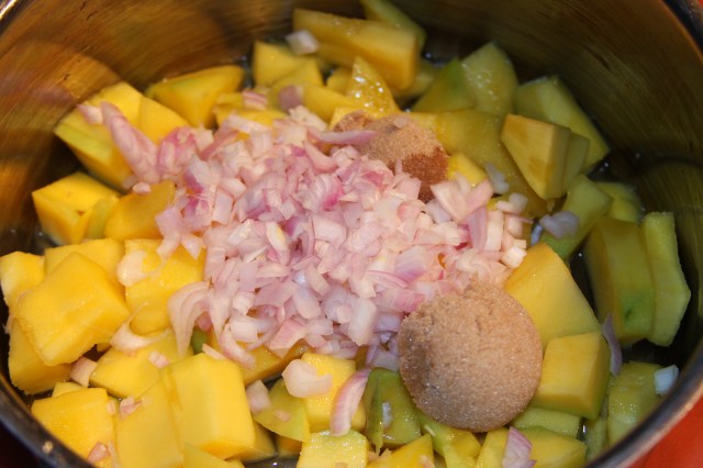 Add to the mango the jalapeno (if your using) and the vinegar, sugar, water and shallot.