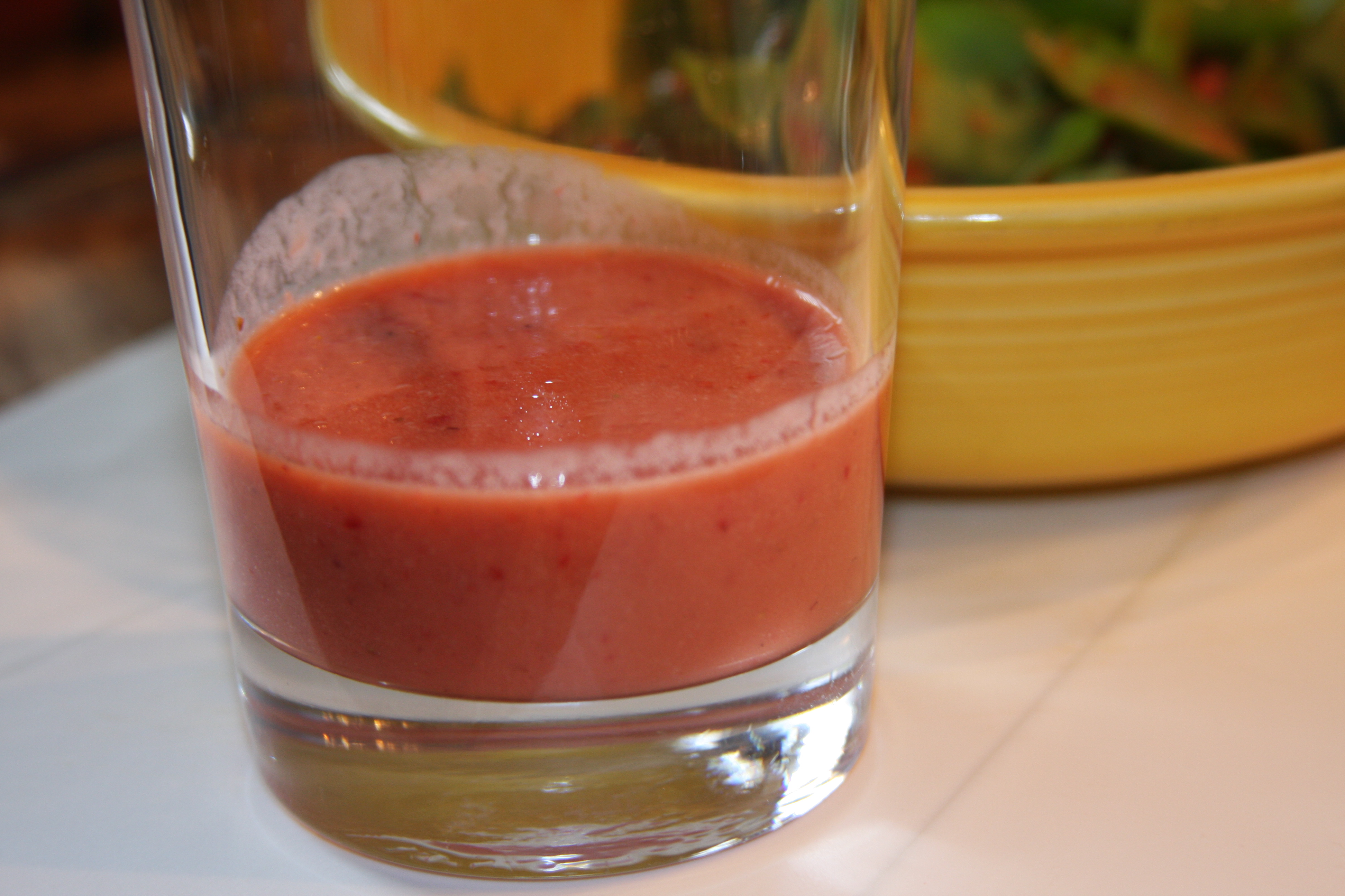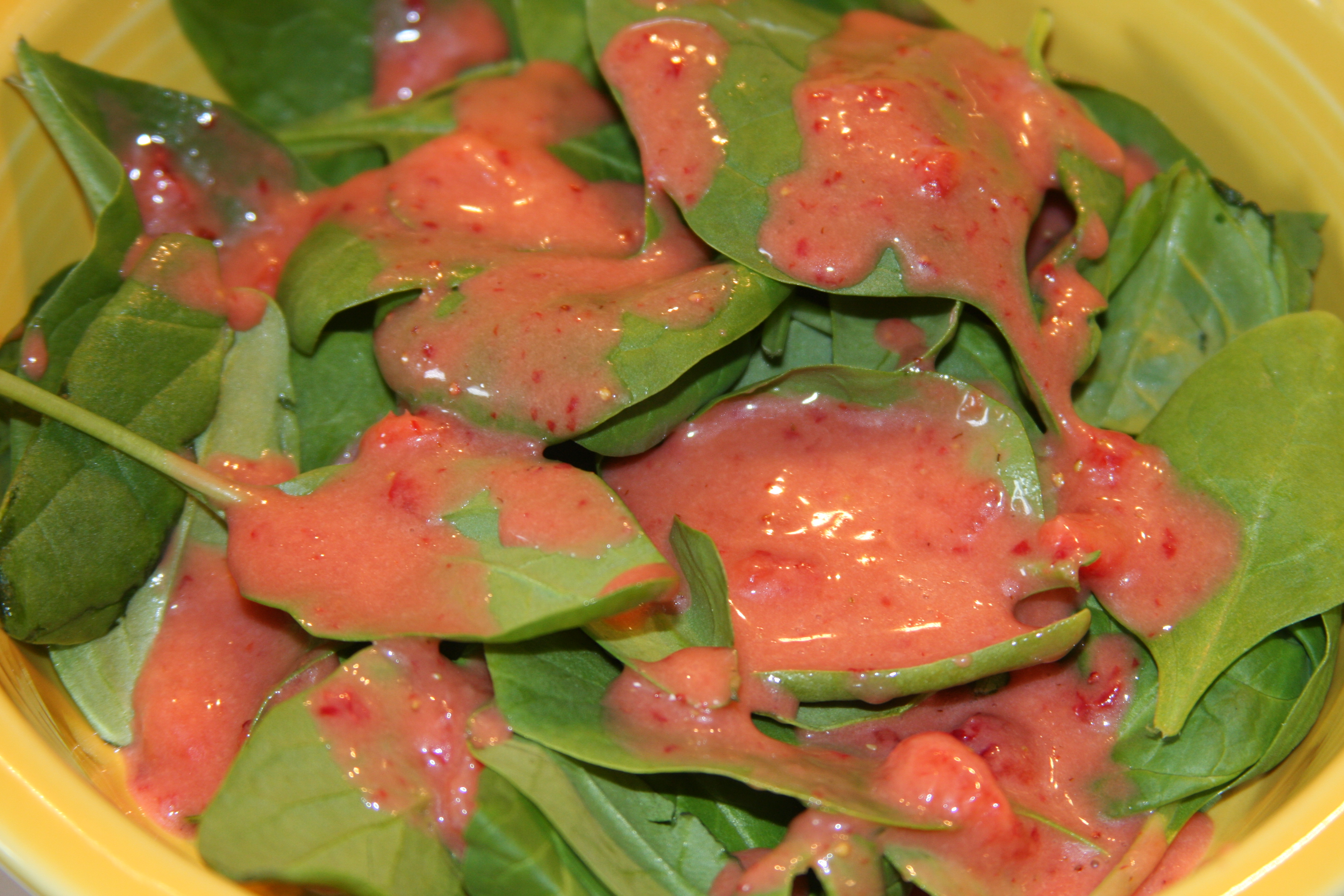 Sometimes not having a bunch of food in the house is a good thing, because it forces me to get creative and use up things that might not get used otherwise. Like today, while I was rummaging through the fridge trying to find something for lunch I found a half a bag of spinach that needed to be eaten, along with some strawberries that were on the verge of going bad. I looked around the kitchen a little more and decided to try to make a strawberry balsamic vinaigrette.