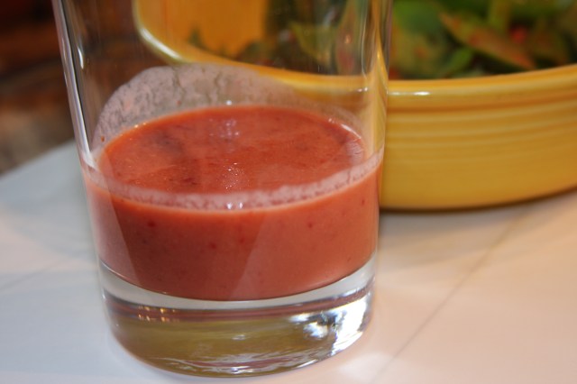Basically you are just going to throw all of this in a blender or food processor and pulse until the strawberries are pureed. I used the magic bullet because it was the perfect size.