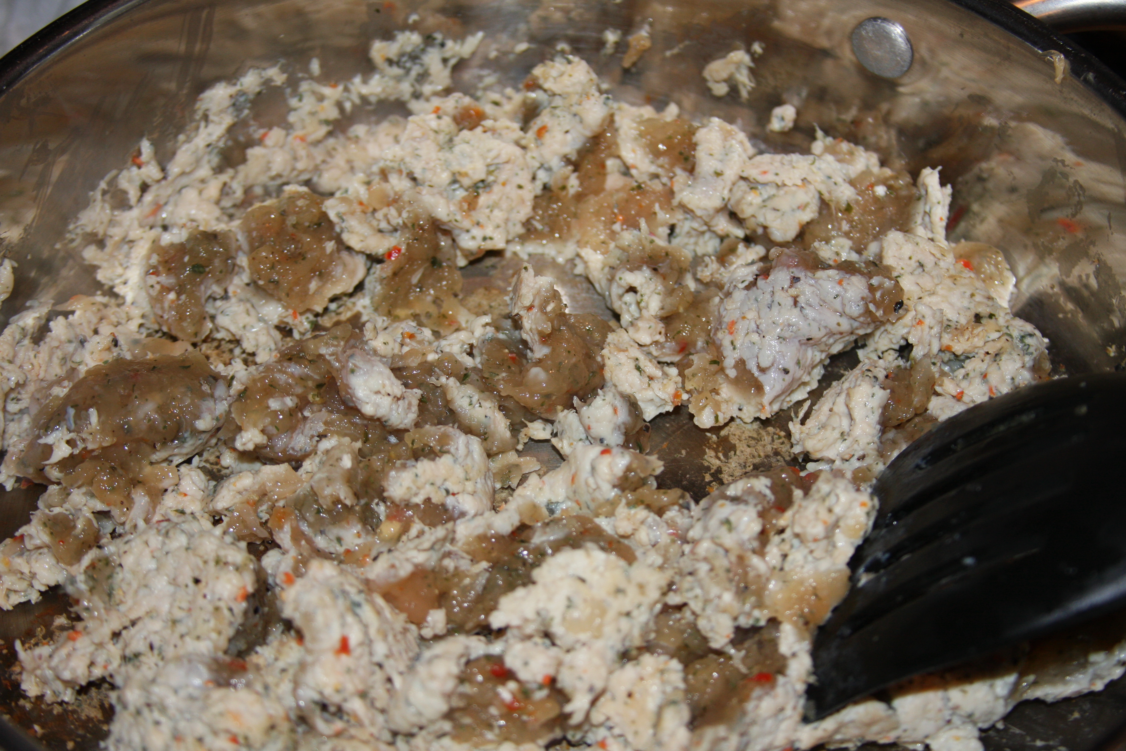 Cook over medium heat, breaking up the chicken into small pieces, until turns white. Remove from heat and set aside.