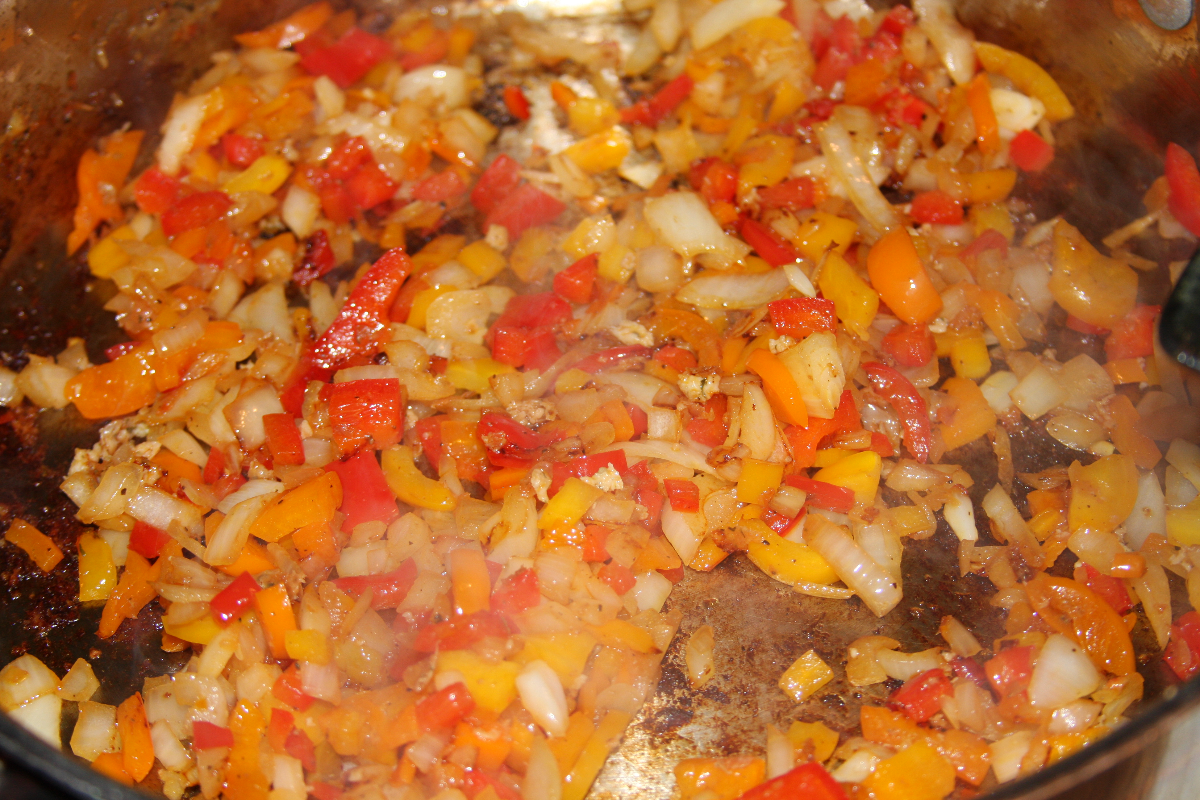 Place skillet back over medium heat and add your oil. Then add your peppers and onion, along with salt and pepper. Cook until veggies have softened and just start to caramelize.
