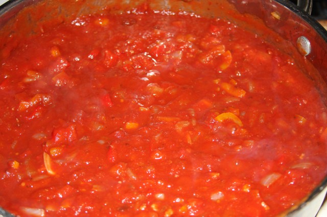 Then add in your can of crushed tomatoes. Stir it around while you scrape off all the tasty bits off the bottom of the pan.