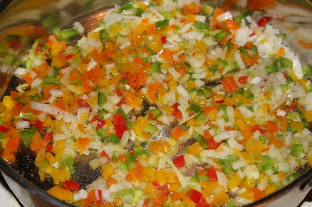 Cook the orzo pasta according to the package directions. While your waiting on that, in a large skillet, over medium heat, add your oil. Then add the peppers and onions and let cook for about 3 minutes or until softened.