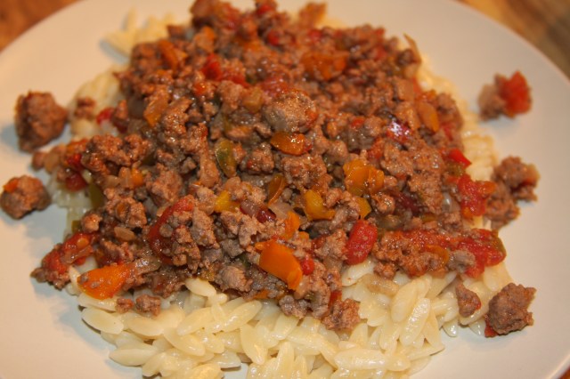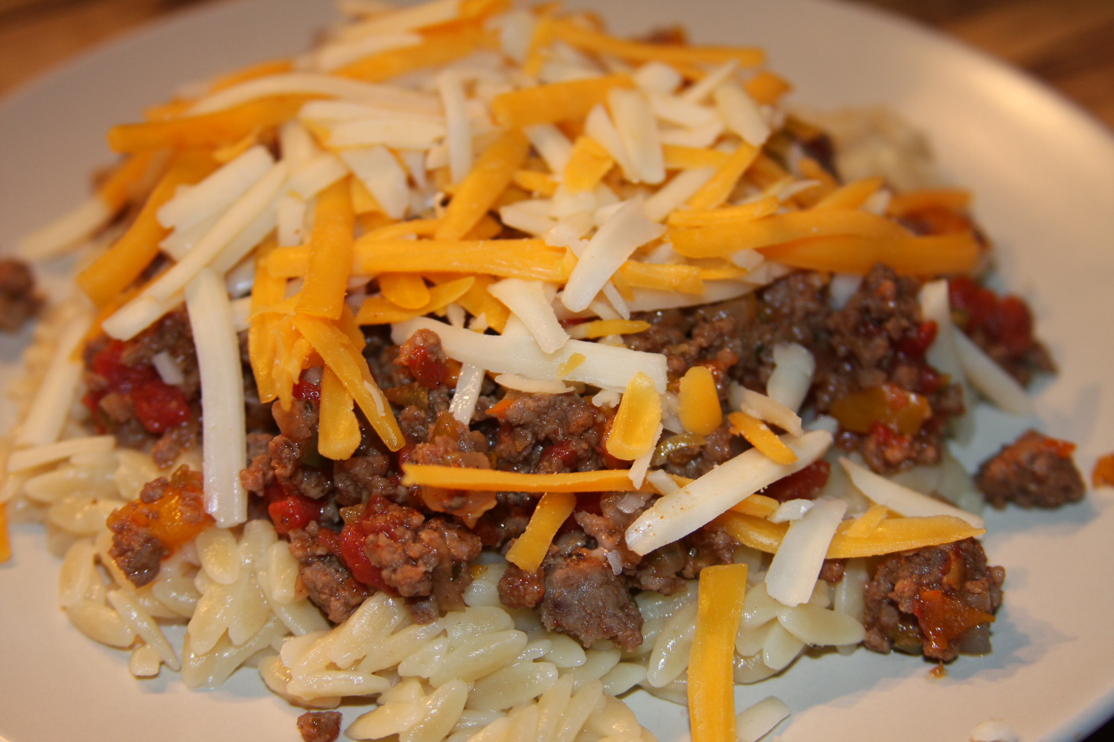 Put the orzo on the plate and then top with the ground beef mixture. You can add a little bit of shredded cheese to the top if you want, but it’s not necessary.