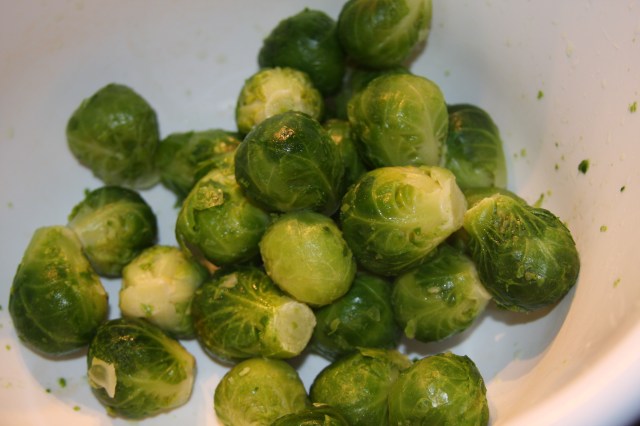 Put your sprouts in a medium size bowl and toss them in the olive oil.