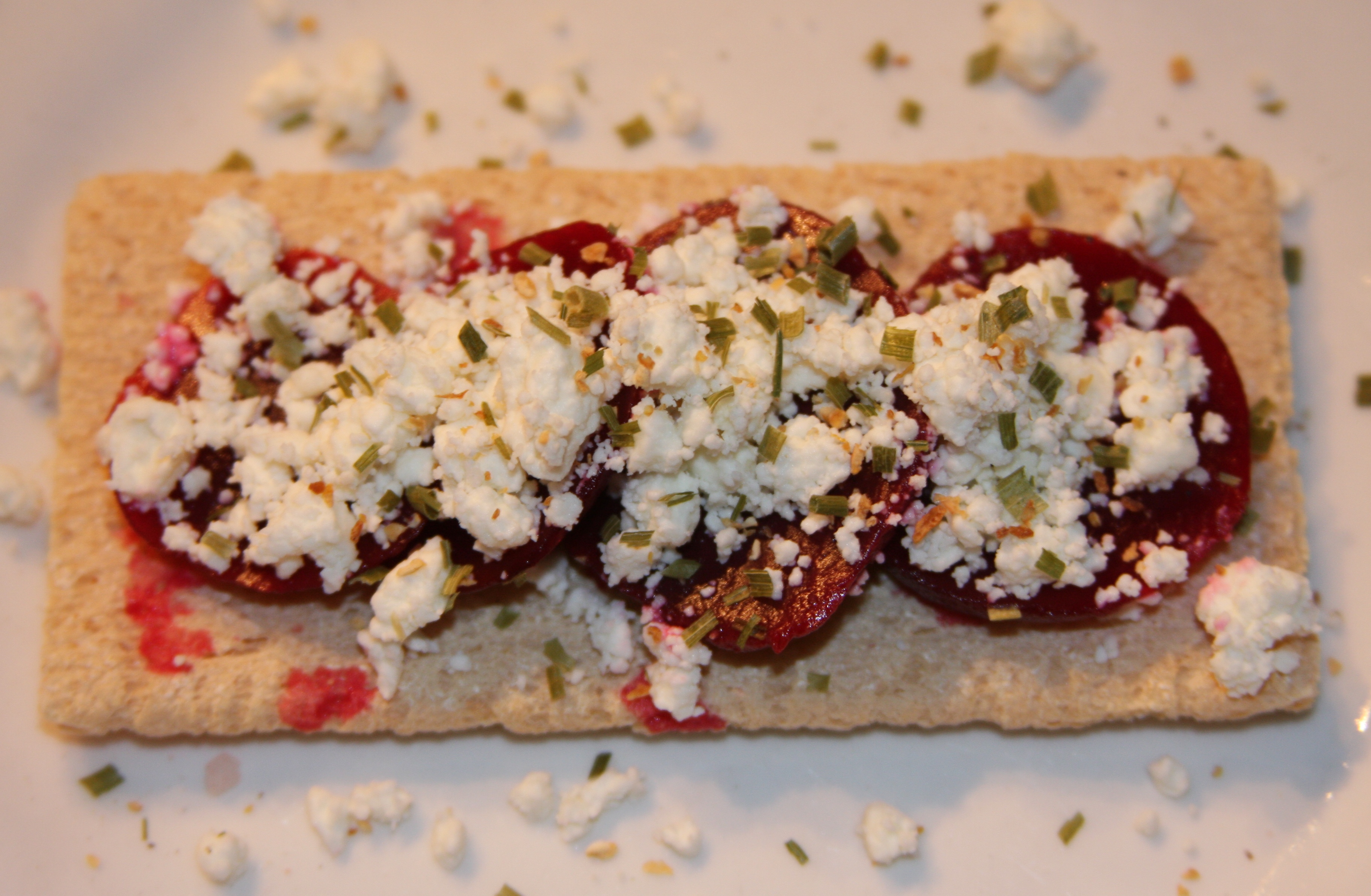 There is no measurement to the recipe, you can add as little or as much of each item, according to your taste. On top of the cracker-bread place the sliced beets, top with the crumbled goat cheese and sprinkle on the lemon peel, chives and salt and pepper.