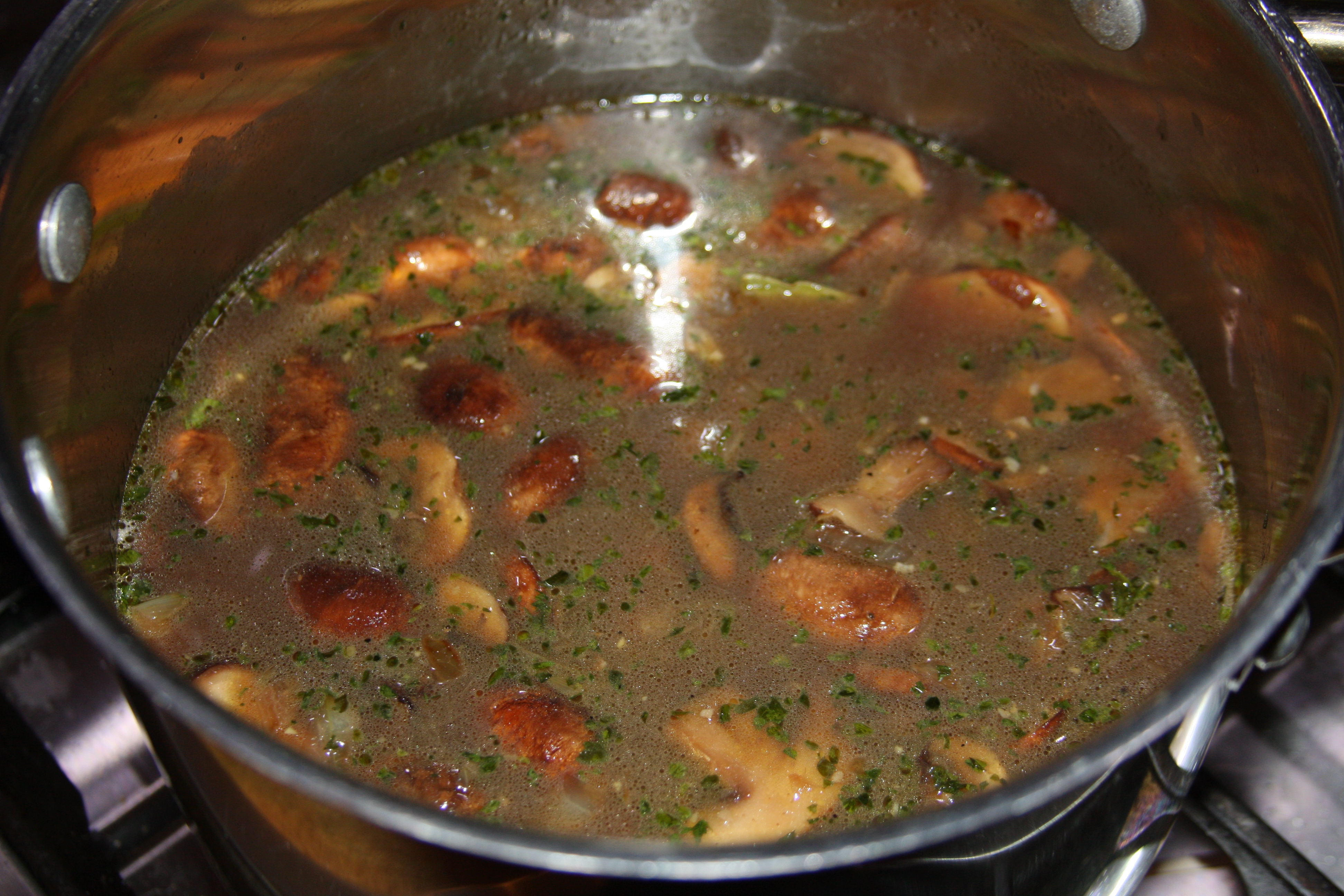 Chop up all your mushrooms and your onion. I chopped the onion up pretty fine, because I didn’t want a bunch of large pieces in the soup, you feel free to do whatever you prefer. In a large skillet, over medium heat, add 1 tablespoon of butter and your chopped onion. Let the onion cook up for about 2-3 minutes, then add your other tablespoon of butter, all of the chopped mushrooms, and the minced garlic. Let all of this cook for about 5 minutes, or until the mushrooms are dark and soft. Sprinkle in the dried parsley and pepper, be cautious with the salt until you know how salty your broth will be.
