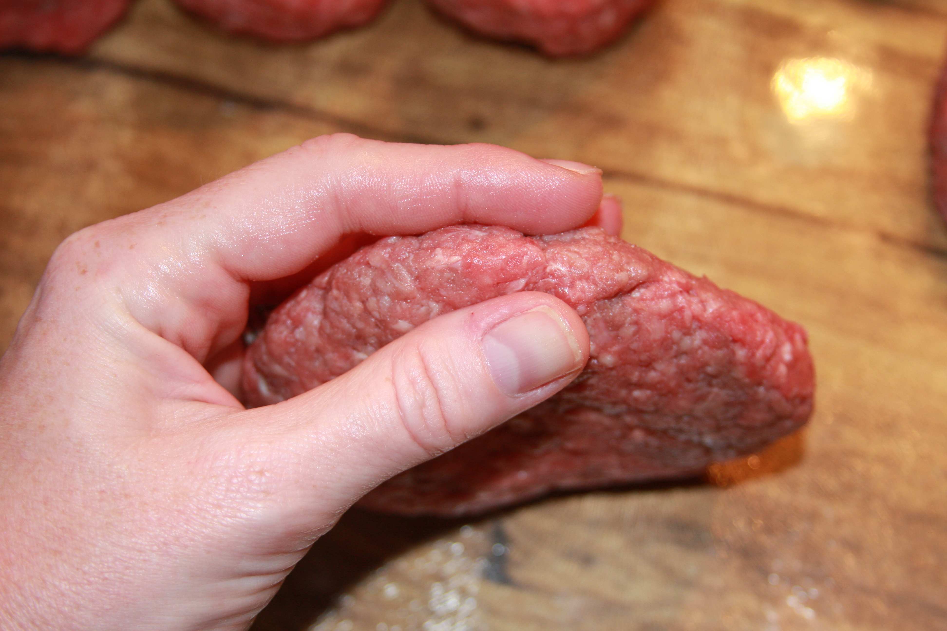 Then you just flatten out the other section of beef so that it is as big around as the first one. Lay it over the top of that one and press down the edges so that they are sealed. Then I usually pick it up in one hand and just pinch the edges together to make sure that they are completely sealed up. You don’t want to lose any of the good stuff when you throw these on the grill. Also, if you make a small indention in the middle of the top of a burger before you grill it, you won’t end up with a bubble burger, it will stay in the same shape and not swell up.
