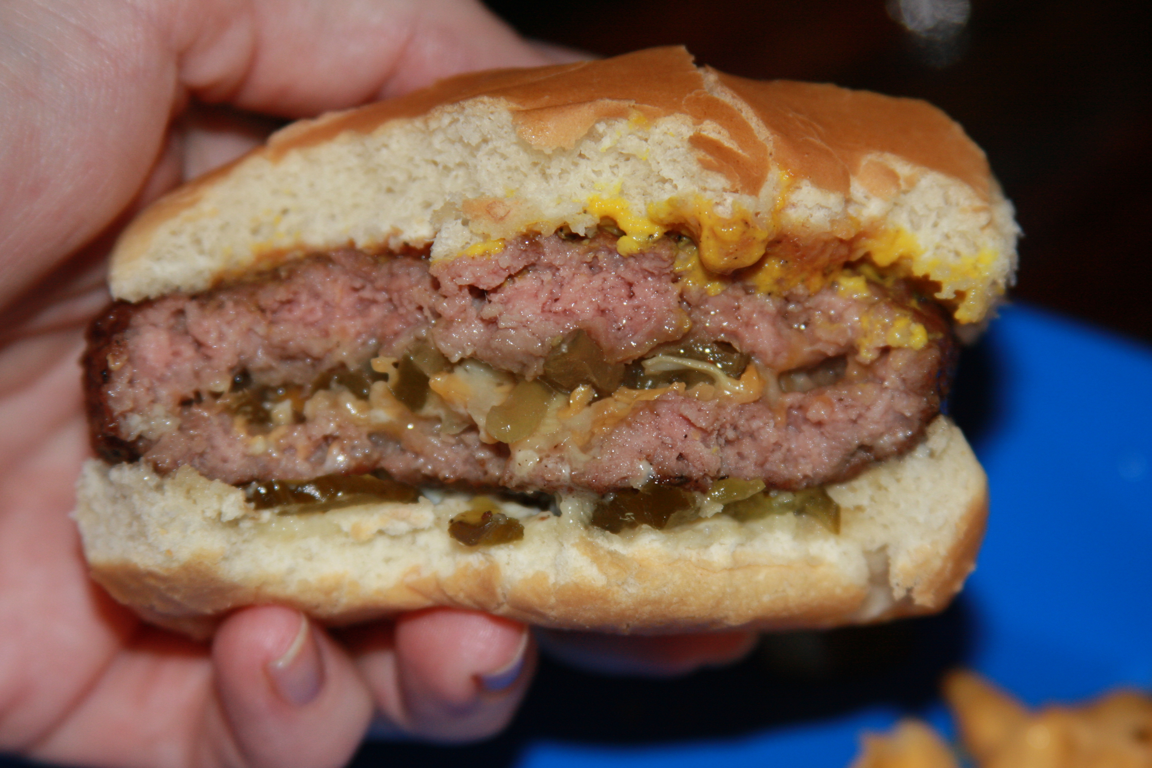We also have a slight addiction to the show Diners, Drive-ins and Dives on the Food Network. Man, I could watch that show all day, except that it makes me so hungry. One night we were watching and saw a burger joint that made stuffed burgers. We just looked at each other and knew that we just had to try that. I mean, it makes total sense to load up the middle of a burger with all of your favorites.